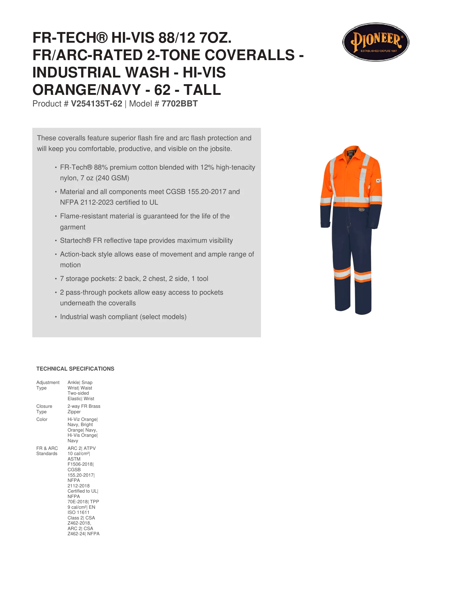 FR-Tech® Hi-Vis 88/12 7oz. FR/ARC–Rated 2–Tone Safety Coveralls – Industrial Wash – Hi-Vis Orange/Navy – 60- Tech Document– Technical Specs