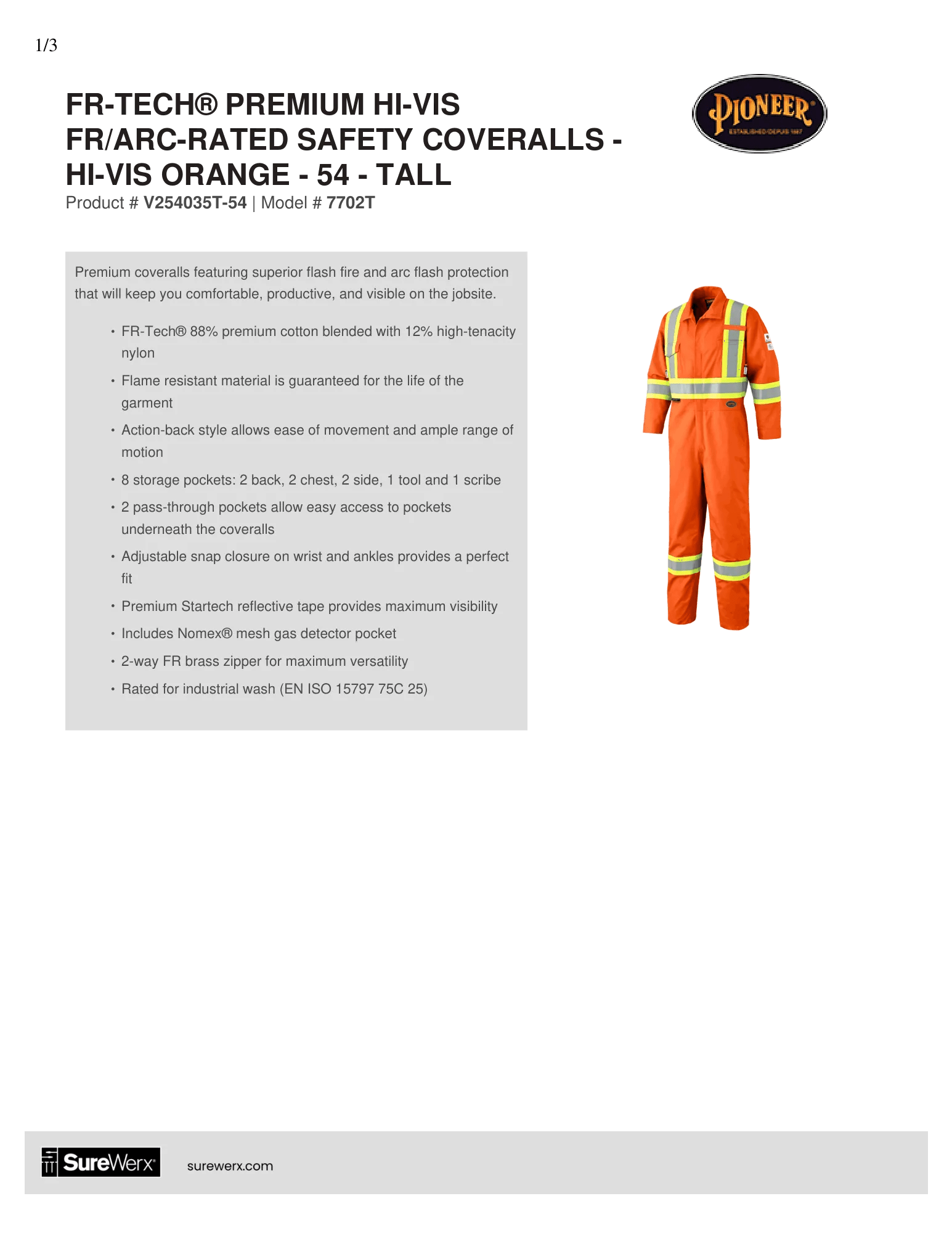 FR-Tech® Premium Hi-Vis FR/ARC-Rated Safety Coveralls – Hi-Vis Orange – 54 – Tall– Technical Specs