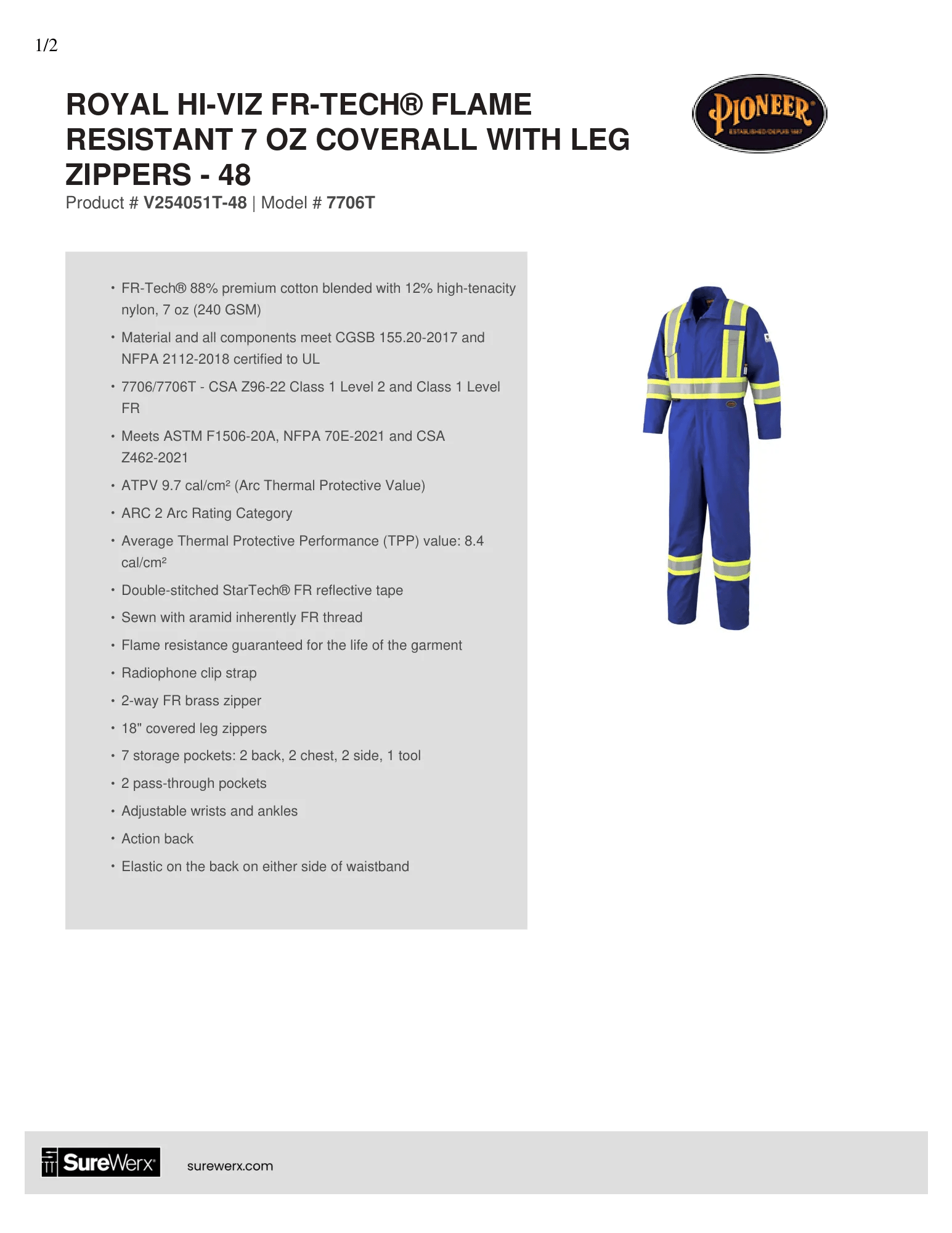 FR-Tech® Hi-Vis 88/12 7 oz FR/ARC-Rated Coveralls – Royal Blue – 50– Technical Specs