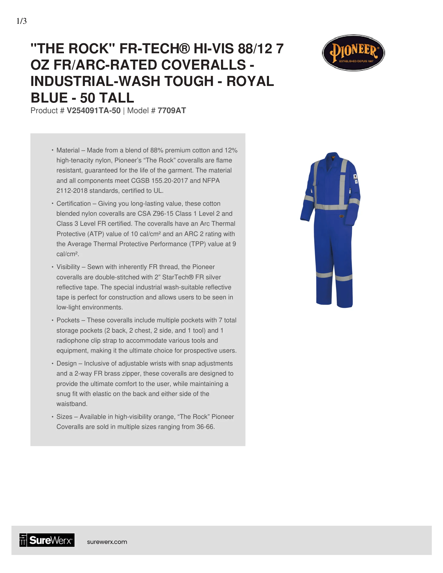 "The Rock" FR-Tech® Hi-Vis 88/12 7 oz FR/ARC-Rated Coveralls – Industrial Wash – Royal Blue – 42- Tech Document– Technical Specs