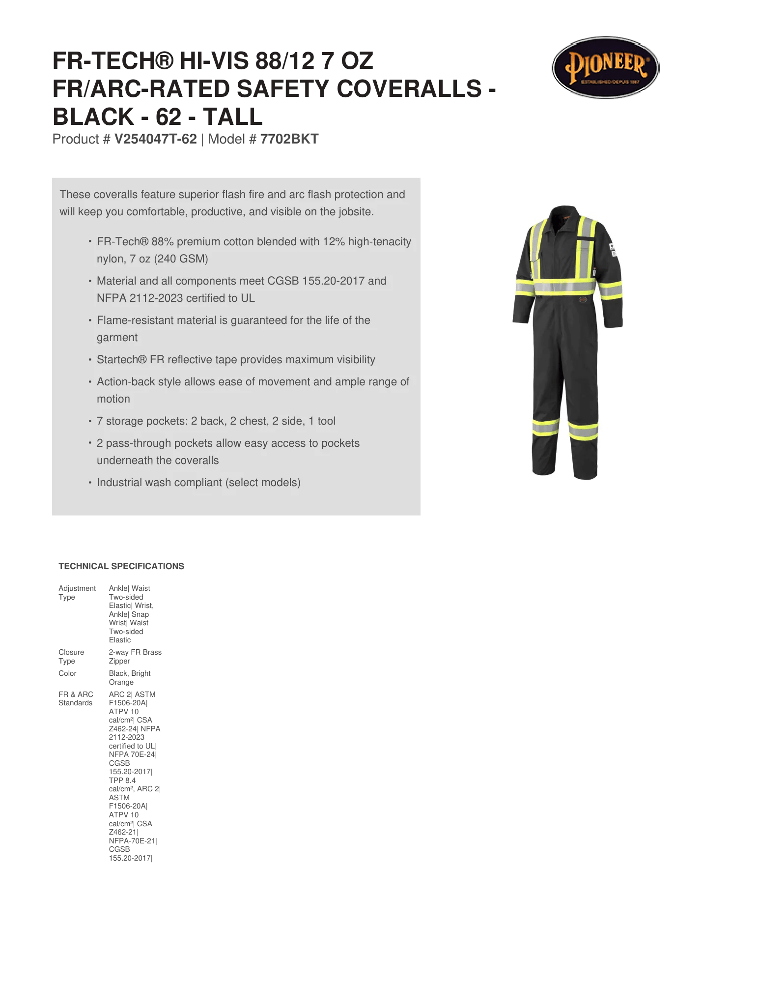 FR-Tech® Hi-Vis 88/12 7 oz FR/ARC–Rated Safety Coveralls – Black – 62– Technical Specs
