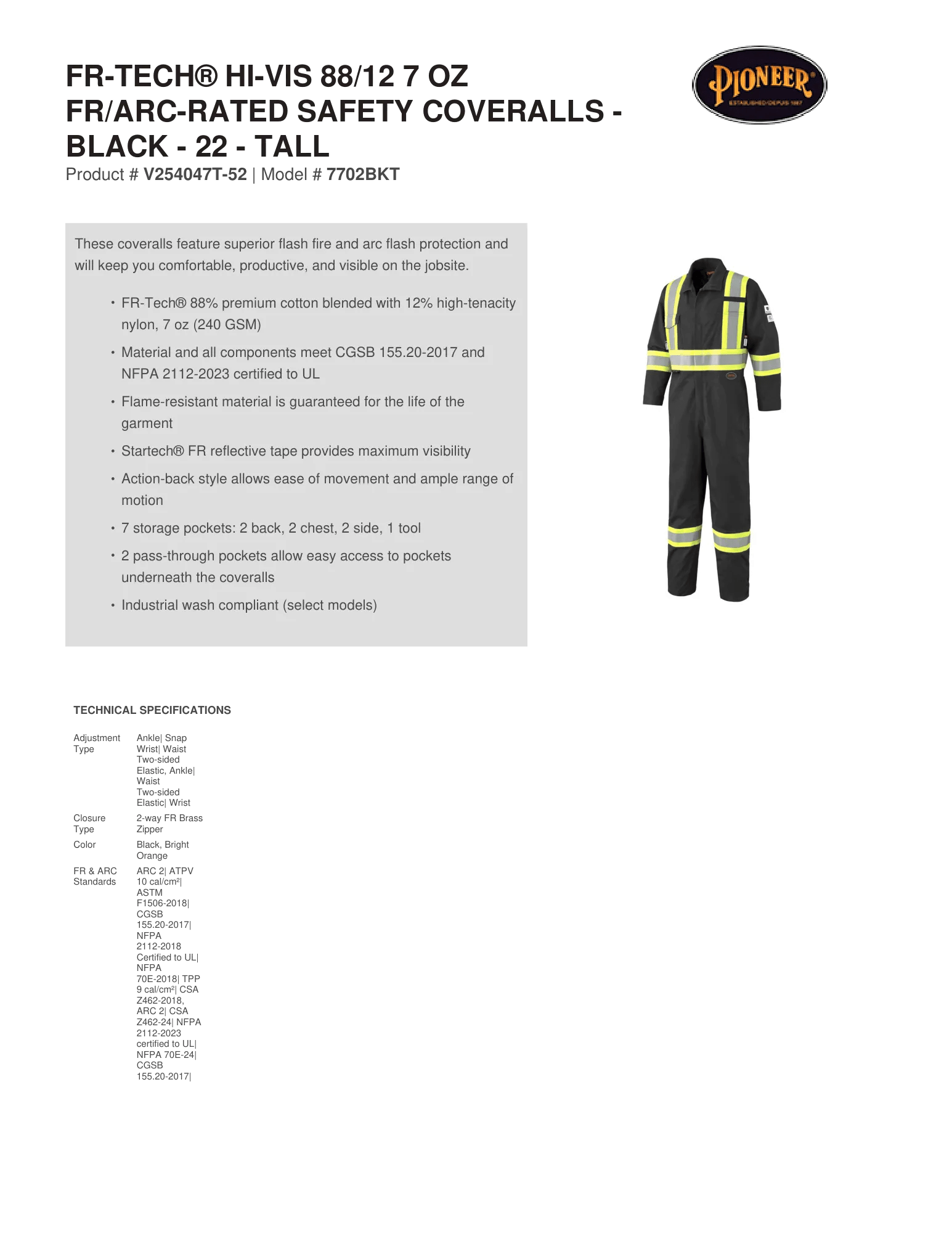 FR-Tech® Hi-Vis 88/12 7 oz FR/ARC–Rated Safety Coveralls – Black – 52– Technical Specs