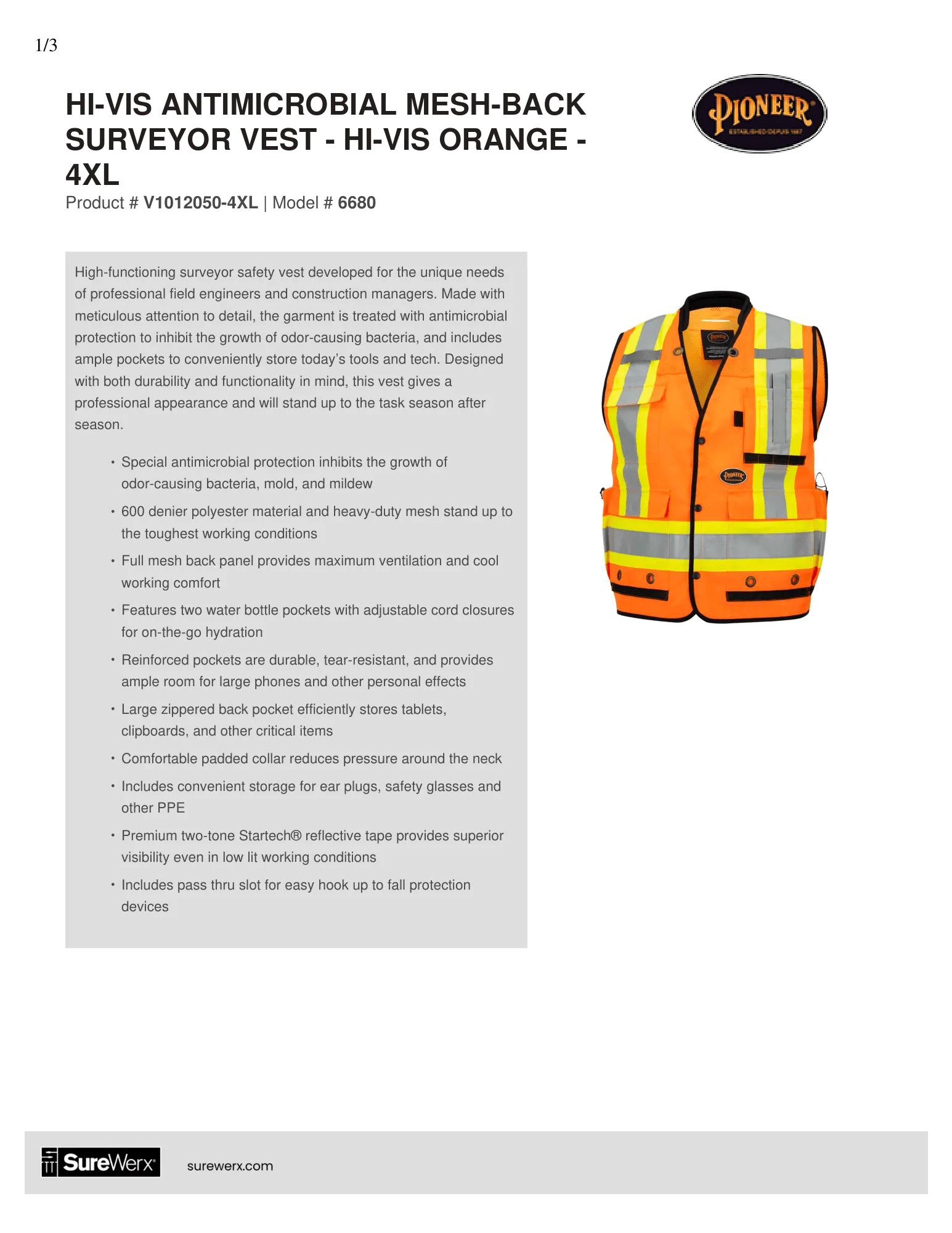 Hi-Vis Antimicrobial Mesh-Back Surveyor Vest - Hi-Vis Orange - 3XL- Tech Document– Technical Specs