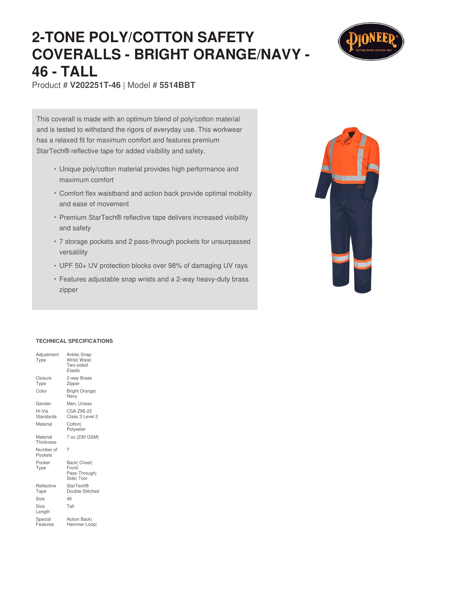 2-Tone Poly/Cotton Safety Coveralls - Bright Orange/Navy - 46 - Tall- Tech Document– Technical Specs