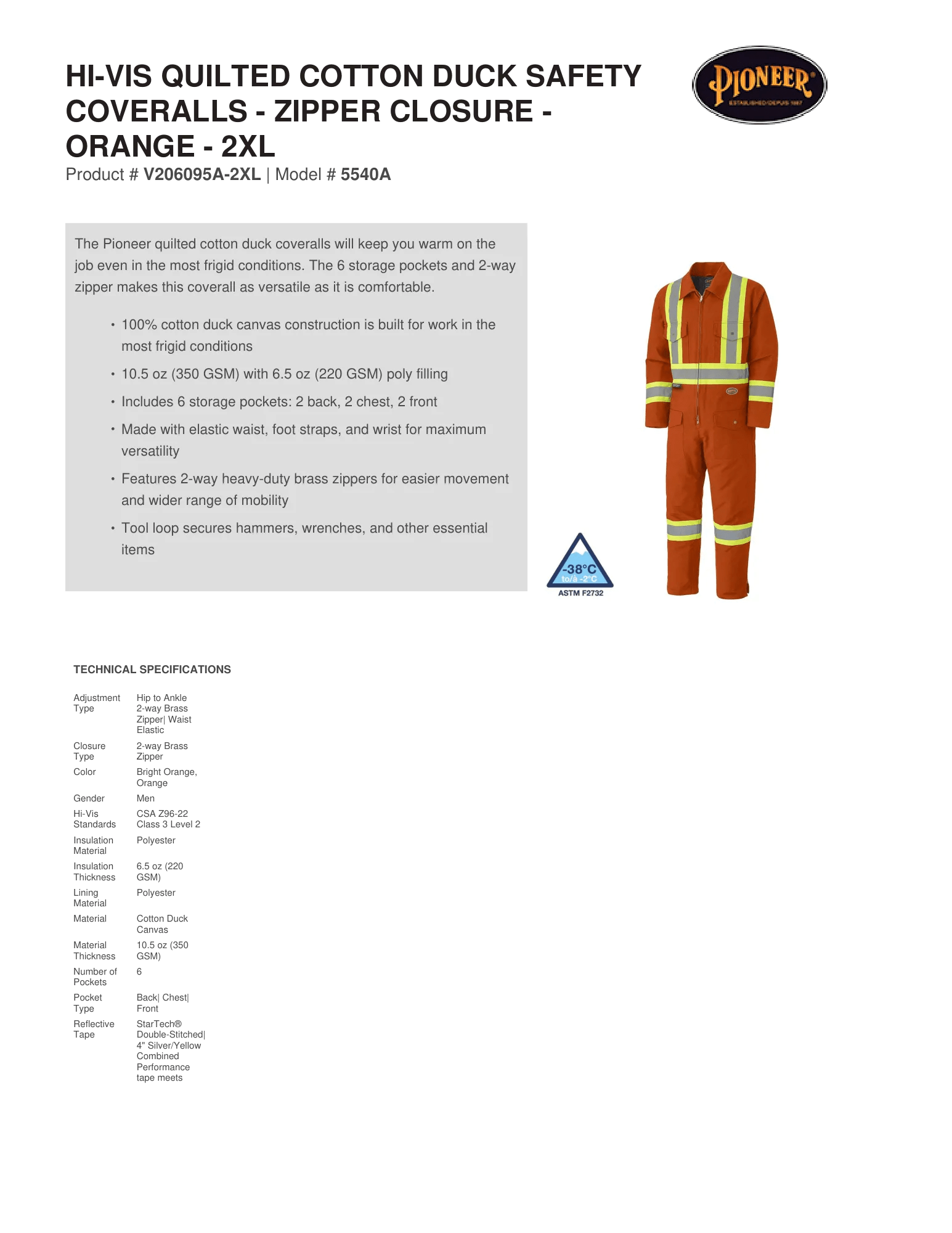 The Pioneer quilted cotton duck coveralls will keep you warm on the job even in the most frigid conditions. The 6 storage pockets and 2-way zipper makes this coverall as versatile as it is comfortable.