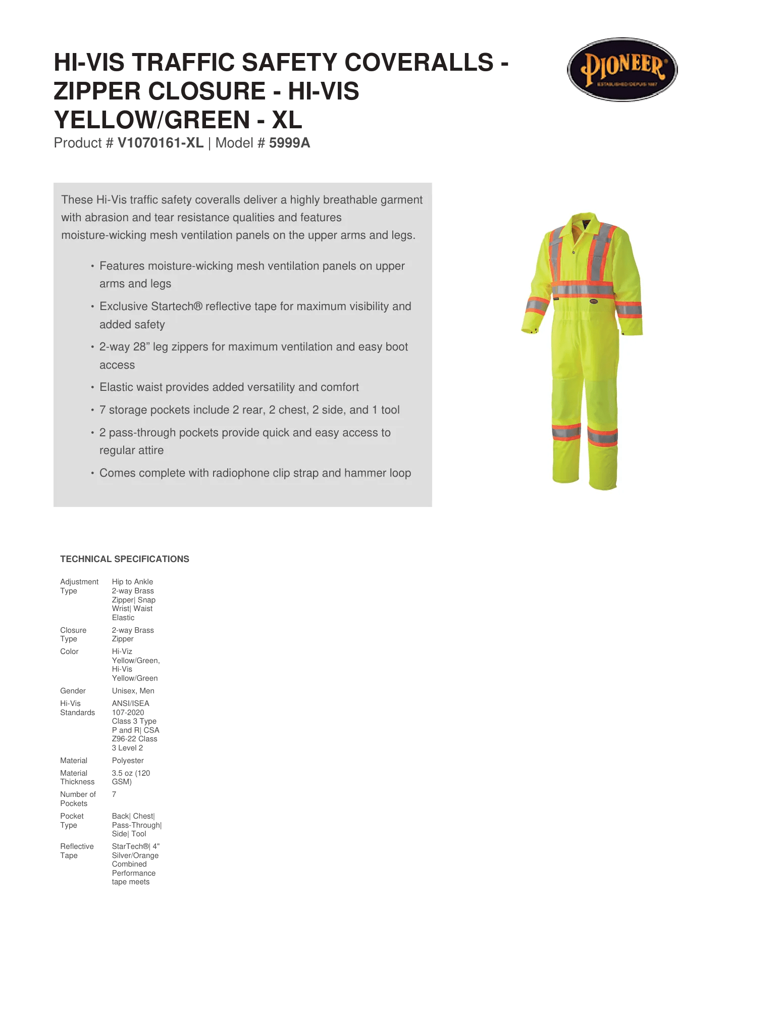Hi-Vis Traffic Safety Coveralls - Zipper Closure - Hi-Vis Yellow/Green - XL– Technical Specs