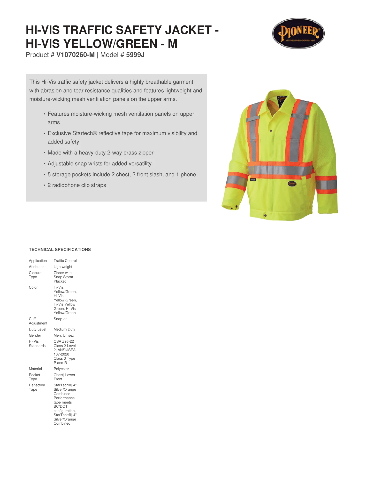 - Hi-Vis Standards: CSA Z96-22 Class 2 Level 2, ANSI/ISEA 107-2020 Class 3 Type P and R