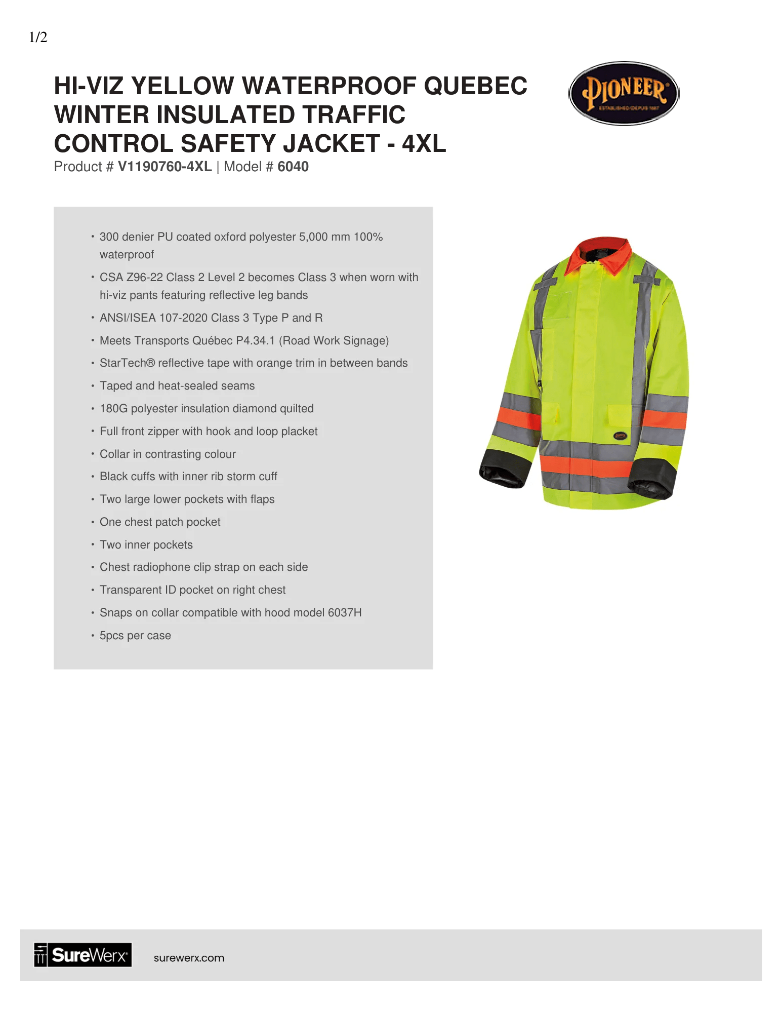 - Hi-Vis Standards: ANSI/ISEA 107-2020 Class 3 Type P and R, CSA Z96-22 Class 2 Level 2, Meets Transports Québec P4.34.1 (Road Work Signage)