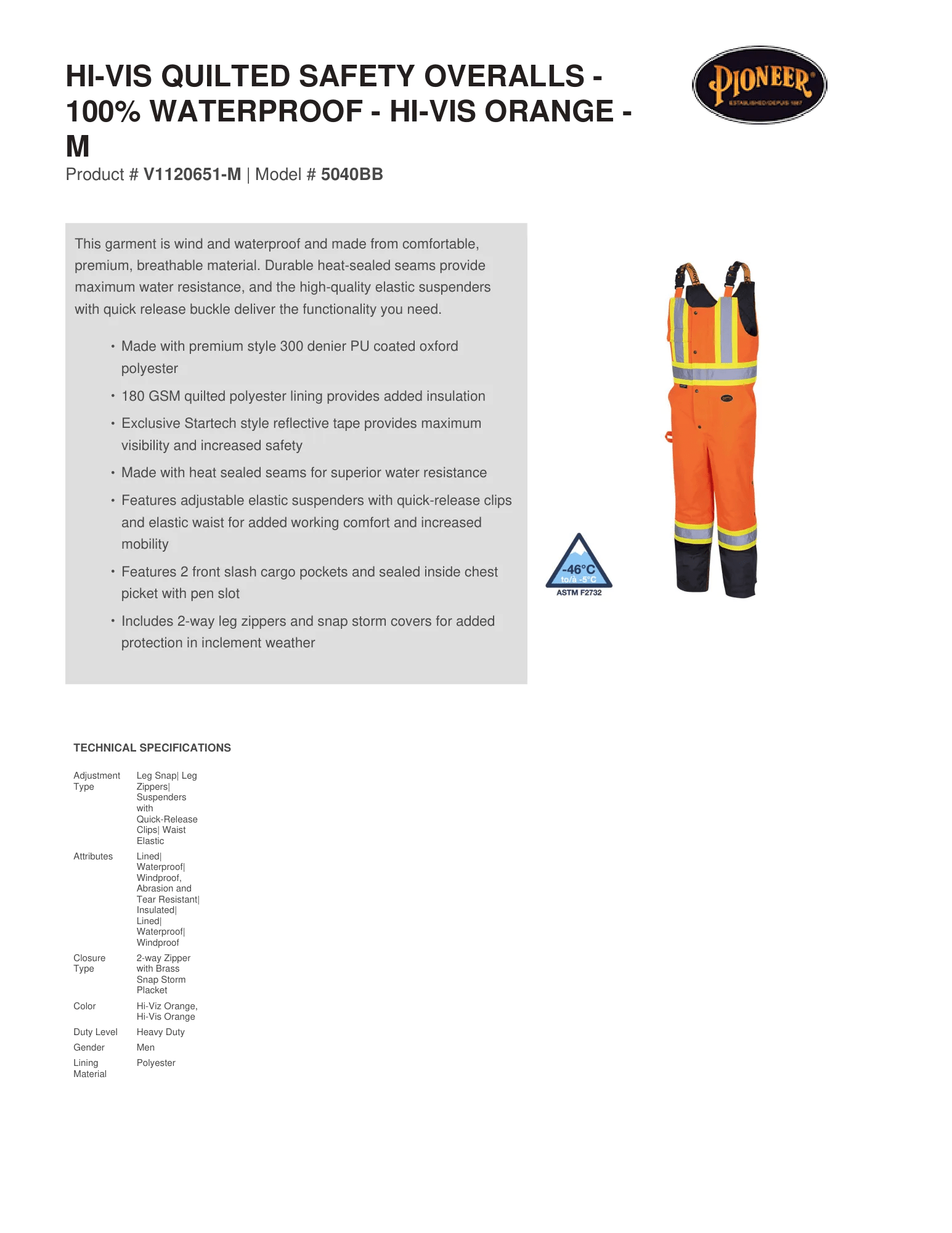 Hi-Vis Quilted Safety Overalls - 100% Waterproof - Hi-Vis Orange - L– Technical Specs