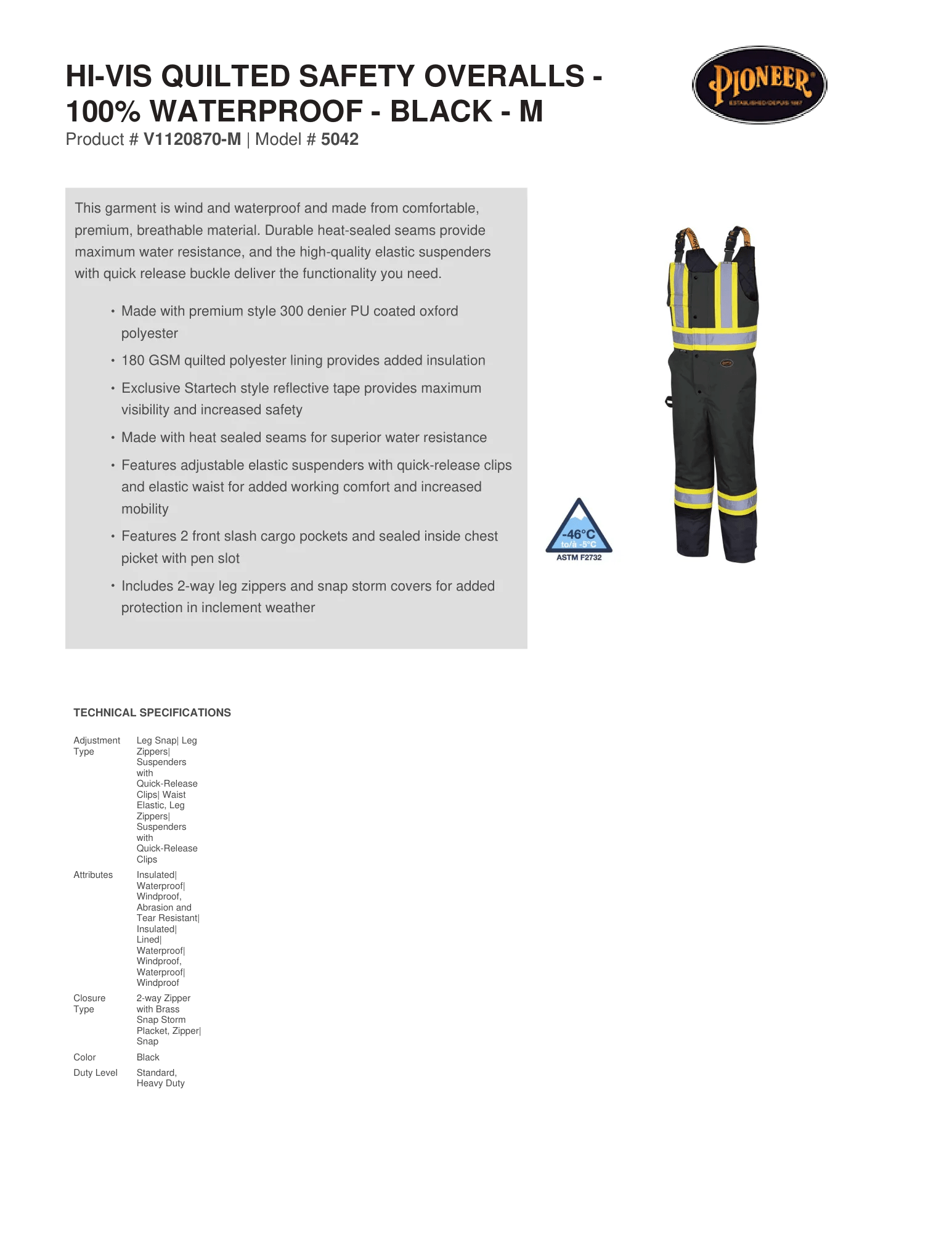 Hi-Vis Quilted Safety Overalls - 100% Waterproof - Black - M– Technical Specs