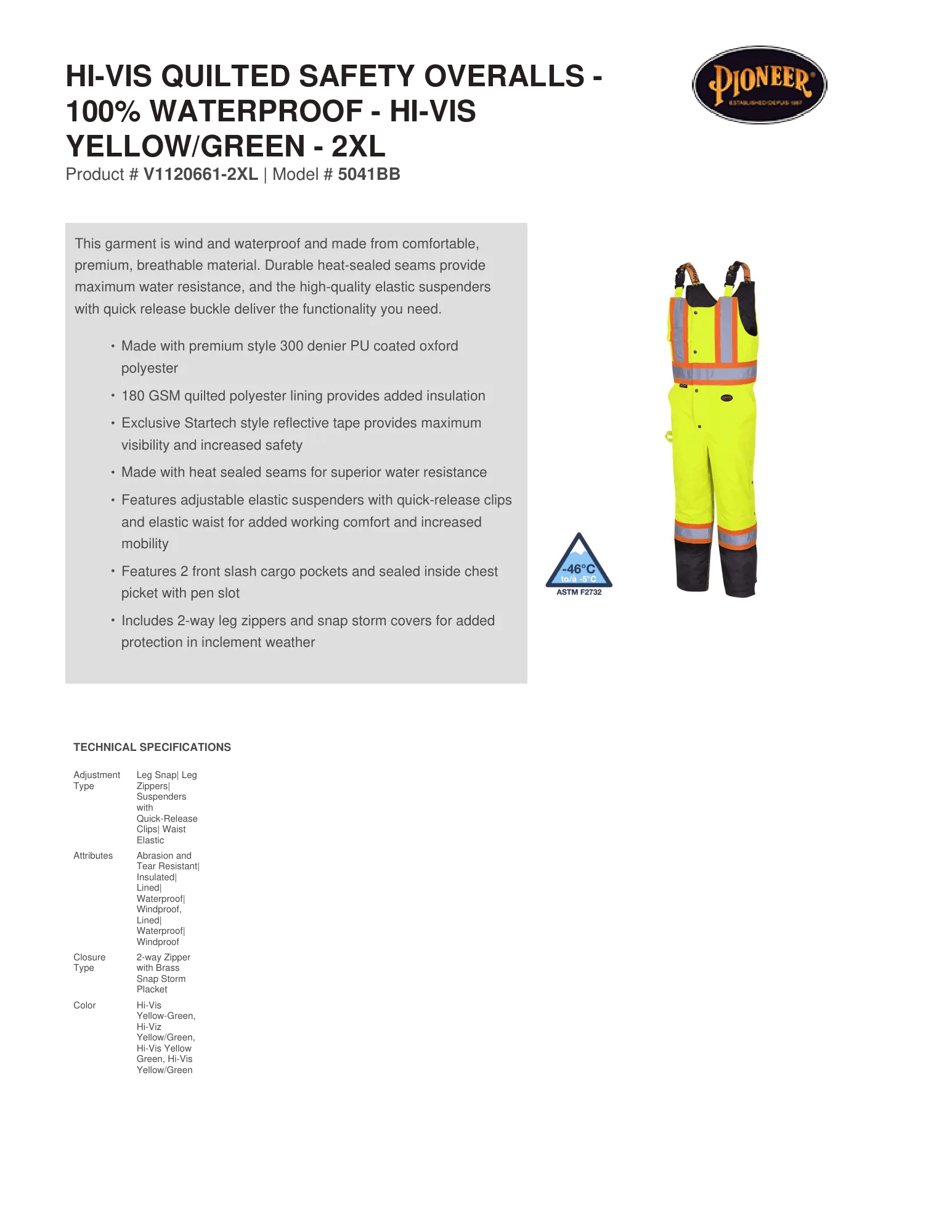 Hi-Vis Quilted Safety Overalls - 100% Waterproof - Hi-Vis Yellow/Green - 2XL– Technical Specs