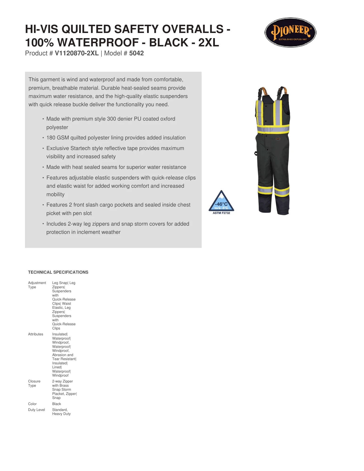 Hi-Vis Quilted Safety Overalls - 100% Waterproof - Black - 2XL– Technical Specs