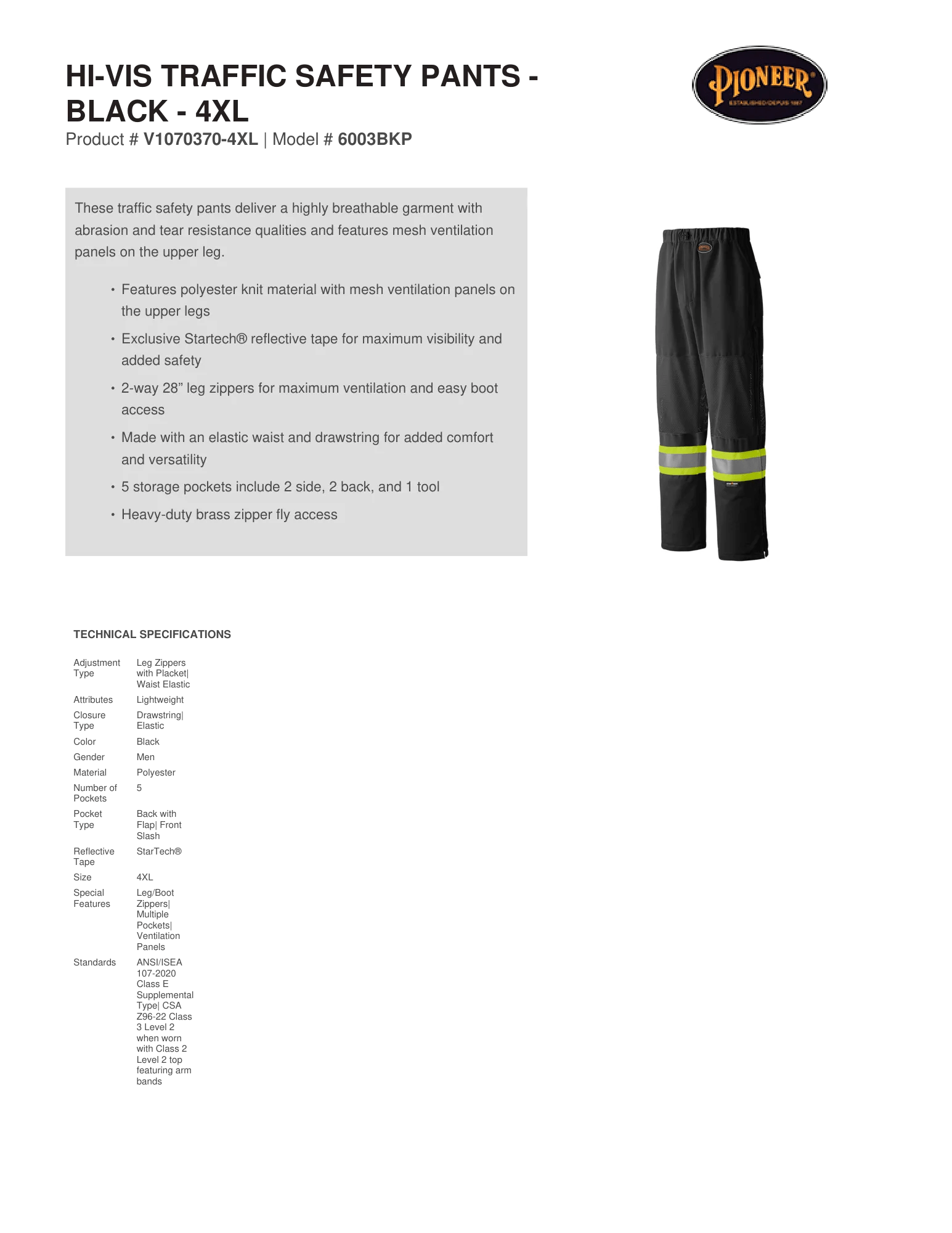 Hi-Vis Traffic Safety Pants - Black – Technical Specs - Pioneer-Sizing-Chart