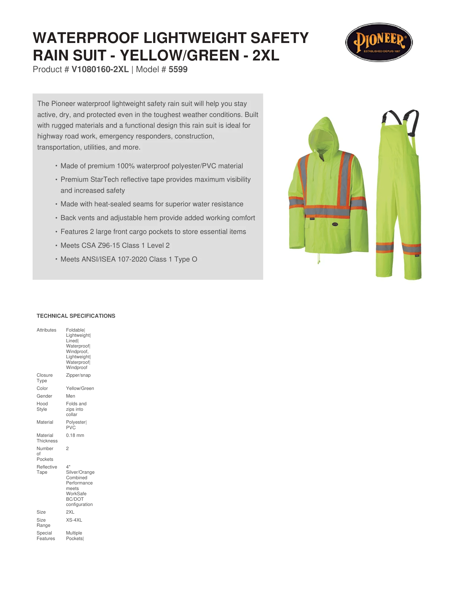 The Pioneer waterproof lightweight safety rain suit will help you stay active dry and protected even in the toughest weather conditions. Built with rugged materials and a functional design this rain suit is ideal for highway road work emergency responders construction transportation utilities and more.