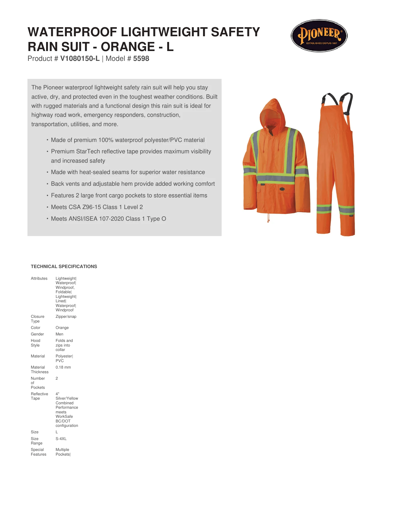 Waterproof Lightweight Safety Rain Suit - Orange - L– Technical Specs