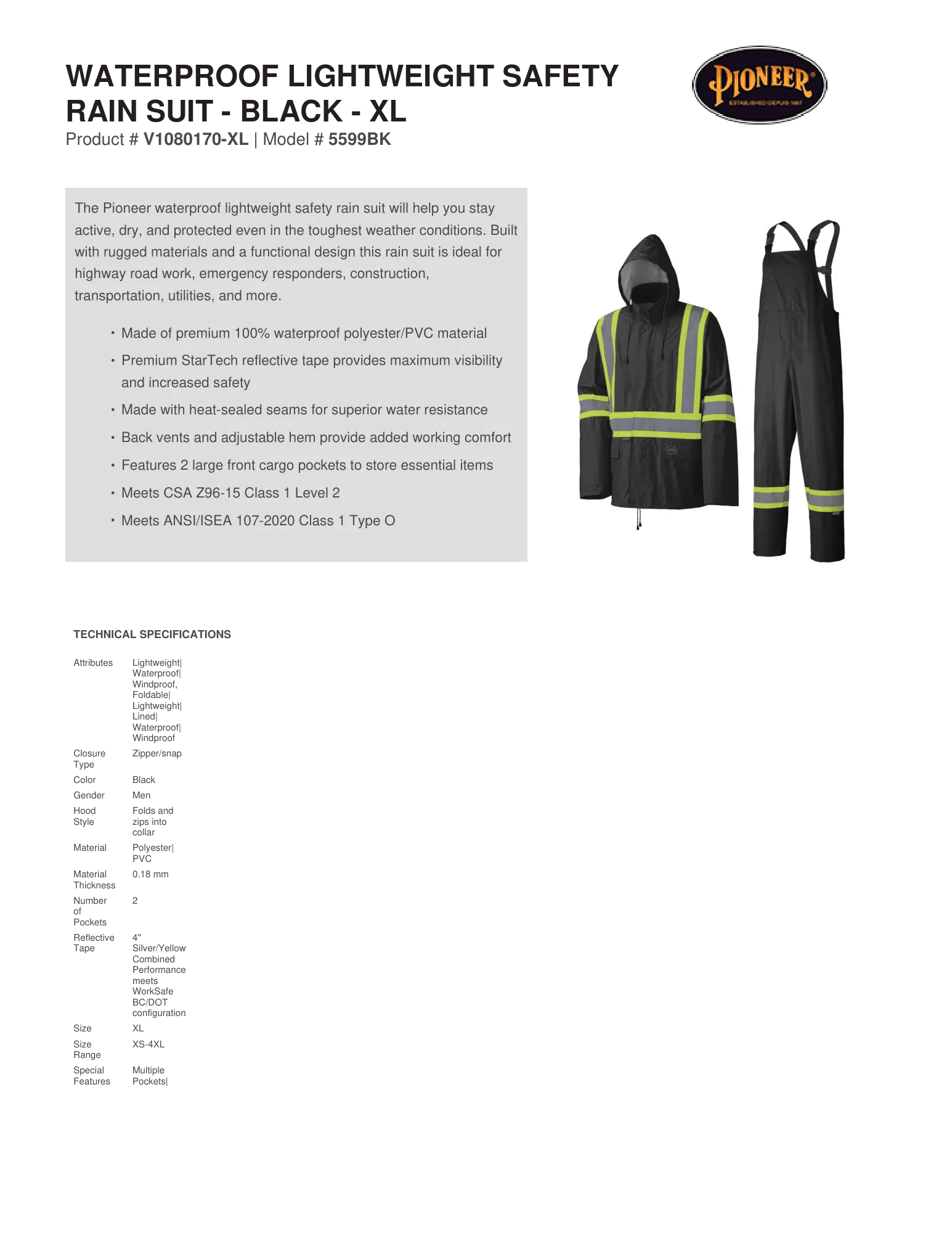 Waterproof Lightweight Safety Rain Suit - Black - L– Technical Specs