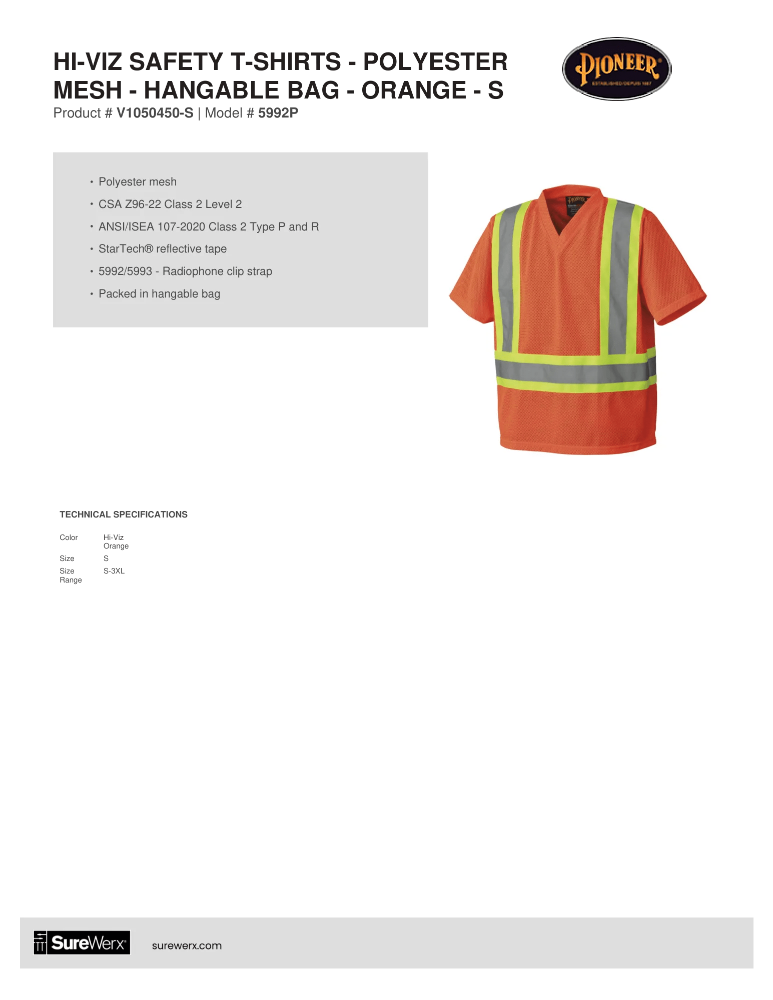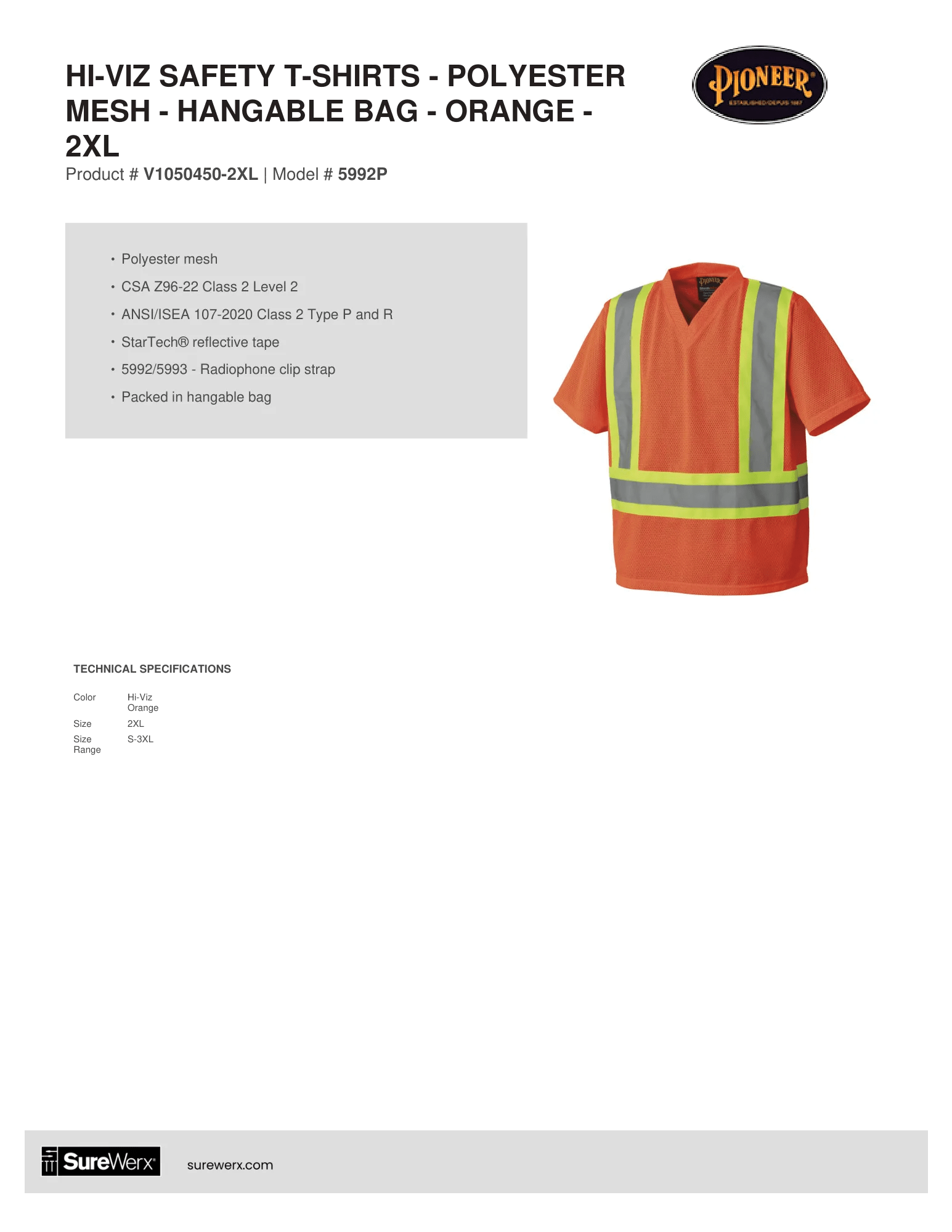 Hi-Vis Mesh Traffic Safety T-Shirt - Hi-Vis Orange - 2XL– Technical Specs