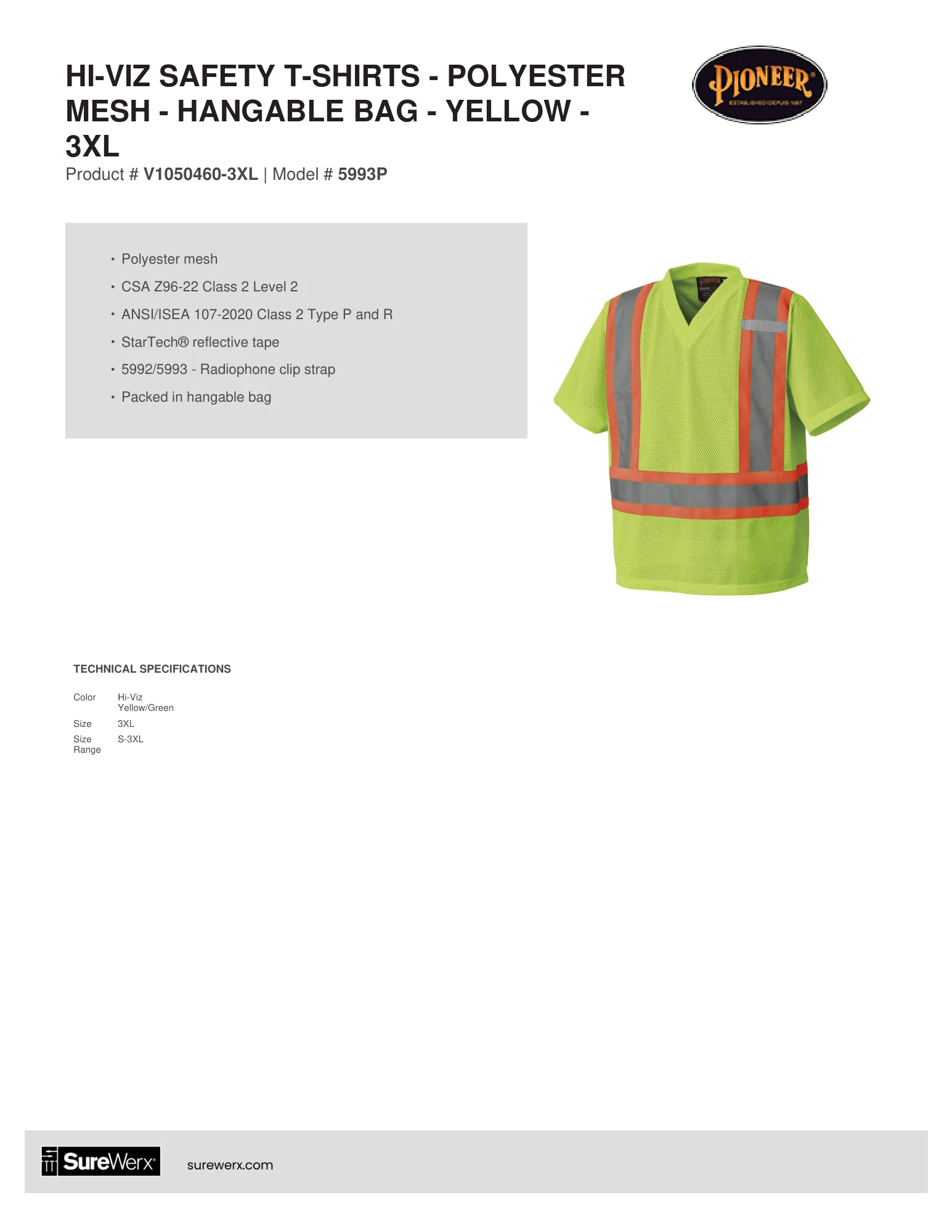 Hi-Vis Mesh Traffic Safety T-Shirt - Hi-Vis Yellow - 3XL– Technical Specs