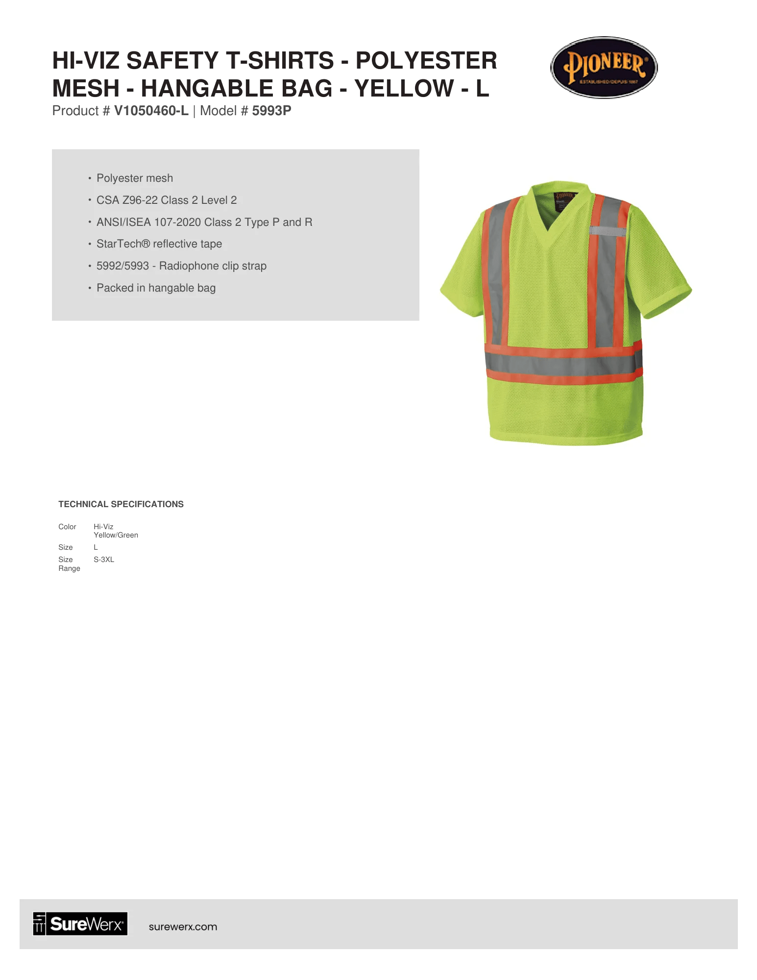 Hi-Vis Mesh Traffic Safety T-Shirt - Hi-Vis Yellow - 2XL– Technical Specs