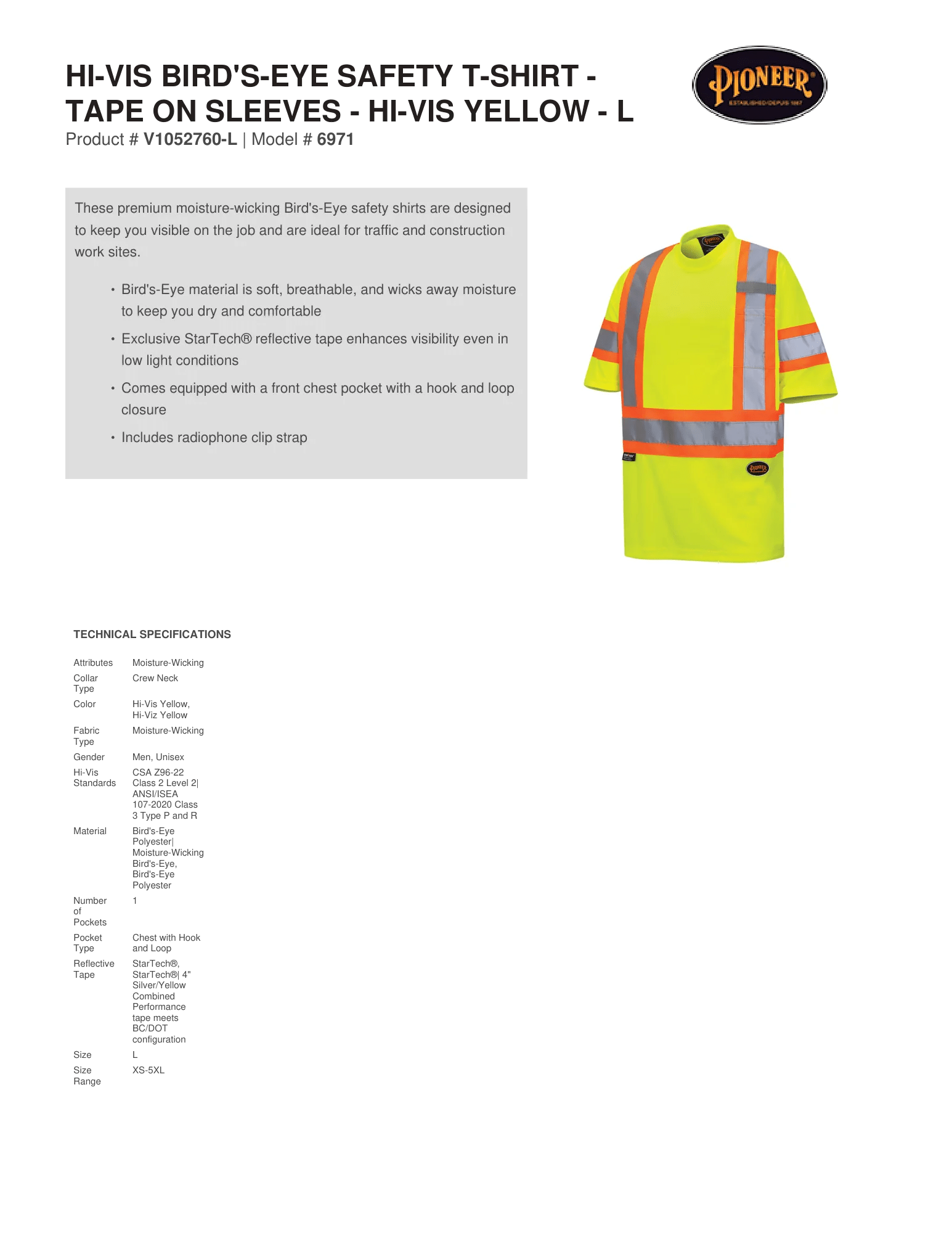 Hi-Vis Bird's-Eye Safety T-shirt - Tape on Sleeves - Hi-Vis Yellow - L– Technical Specs