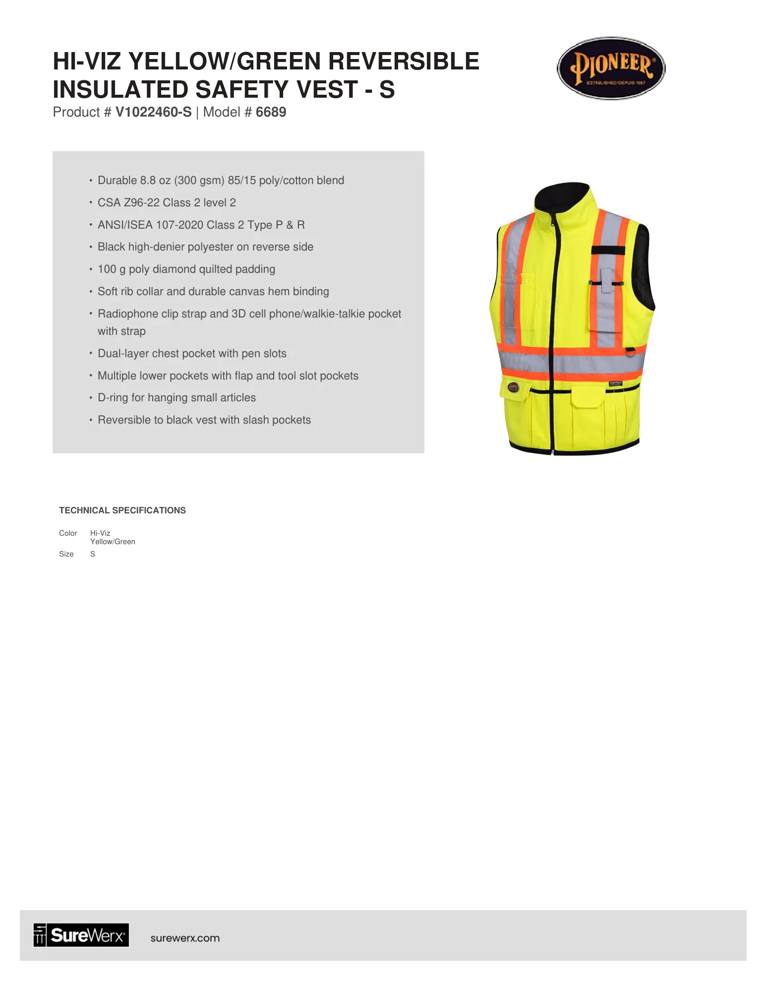 Hi-Vis Reversible Insulated Safety Vest - Zipper Closure - Hi-Vis Yellow/Green/Black - S– Technical Specs