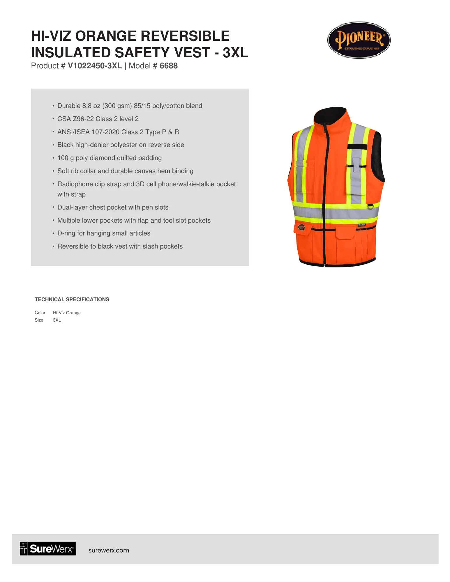 Hi-Vis Reversible Insulated Safety Vest - Zipper Closure - Hi-Vis Orange/Black - S– Technical Specs - Pioneer-Sizing-Chart