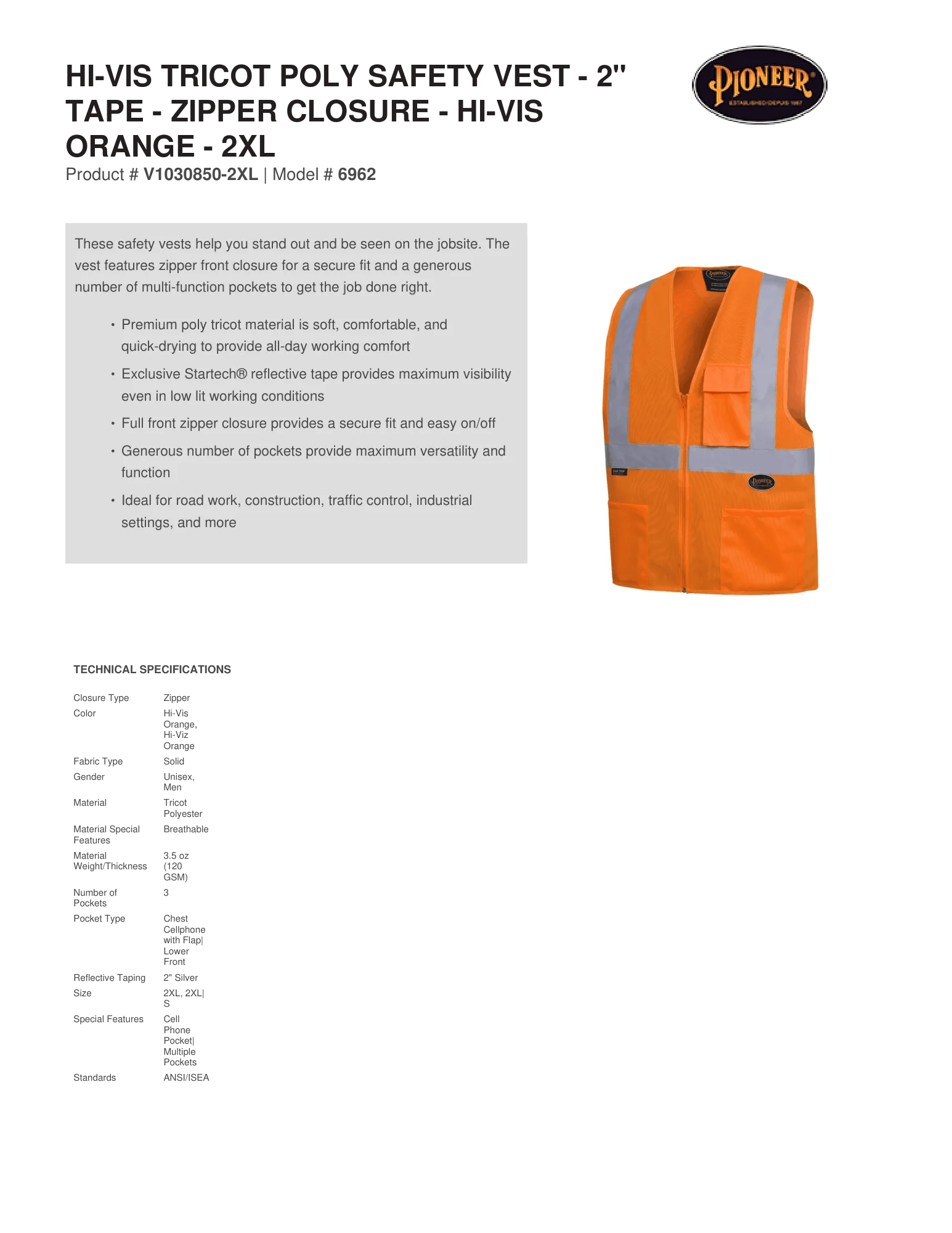 Hi-Vis Tricot Poly Safety Vest - 2" Tape - Zipper Closure - Hi-Vis Orange - 2XL– Technical Specs