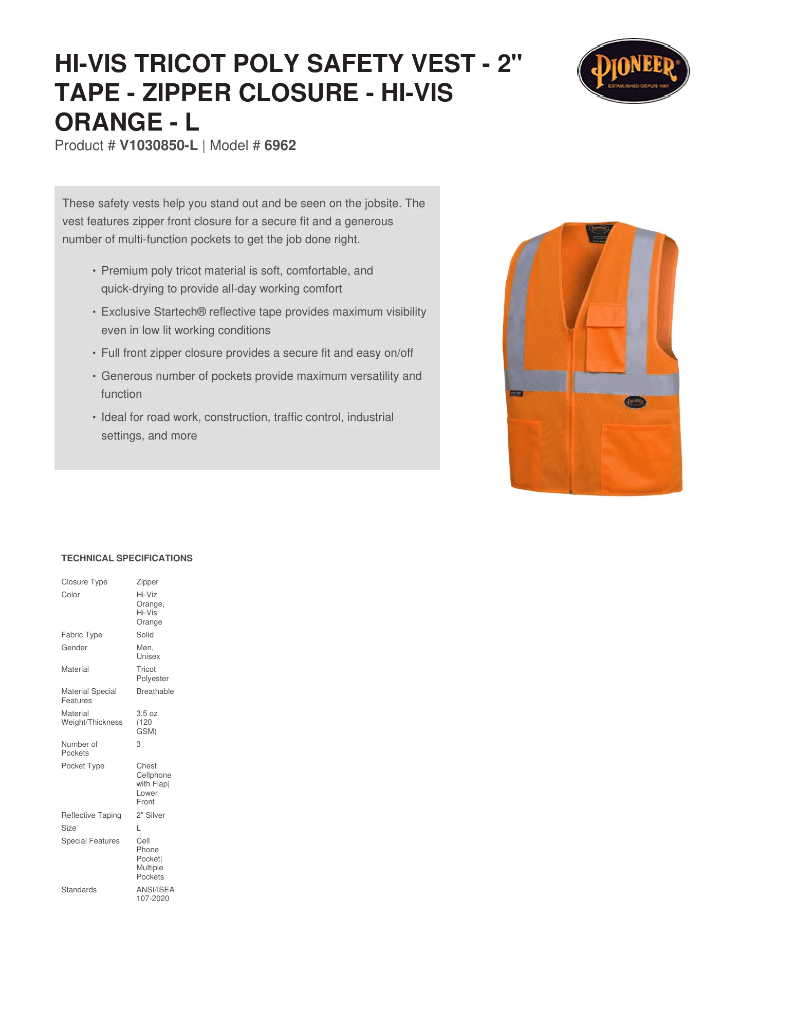 Hi-Vis Tricot Poly Safety Vest - 2" Tape - Zipper Closure - Hi-Vis Orange - L– Technical Specs