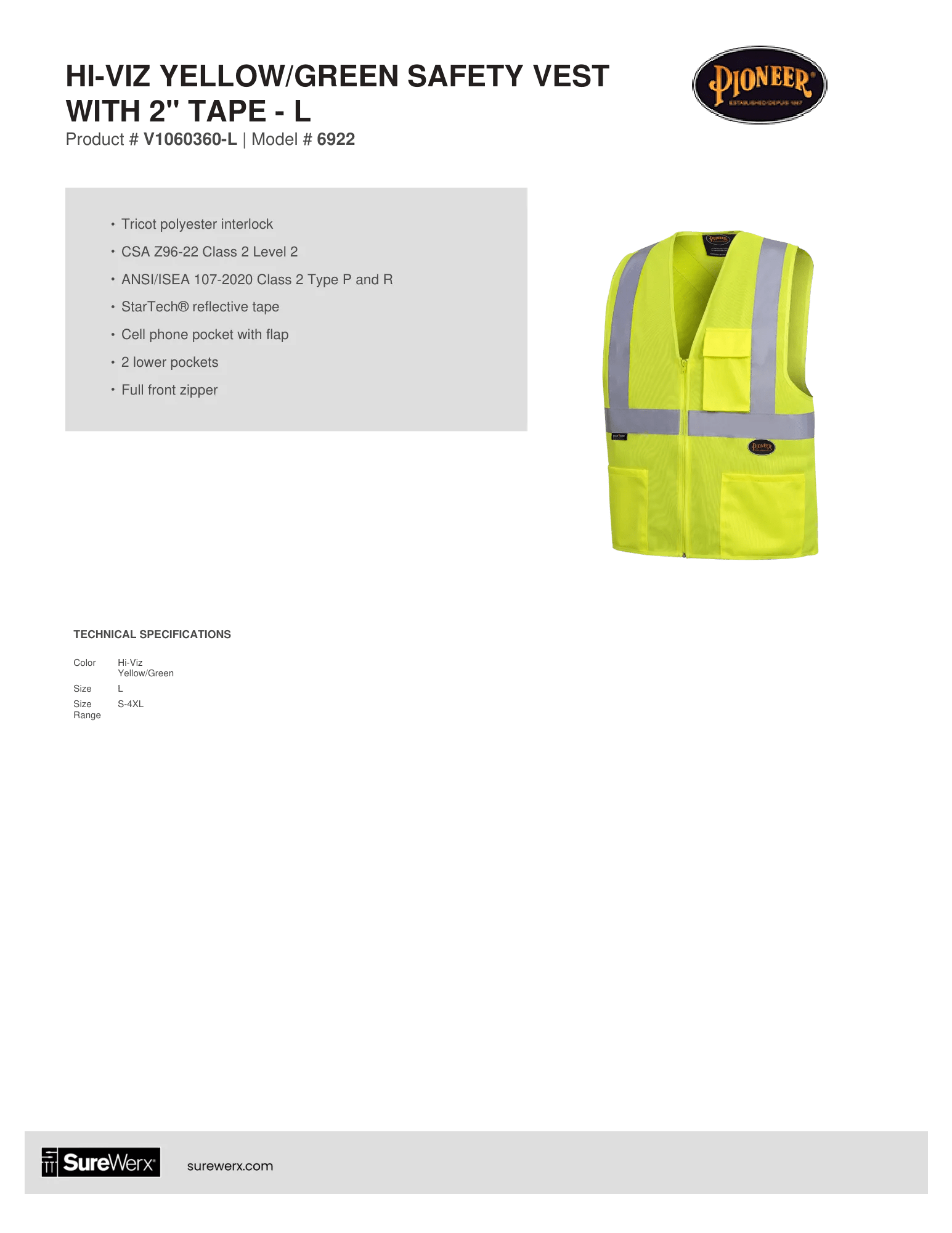 - Standards: CSA Z96-22 Class 2 Level 2, ANSI/ISEA 107-2020 Class 2 Type P and R