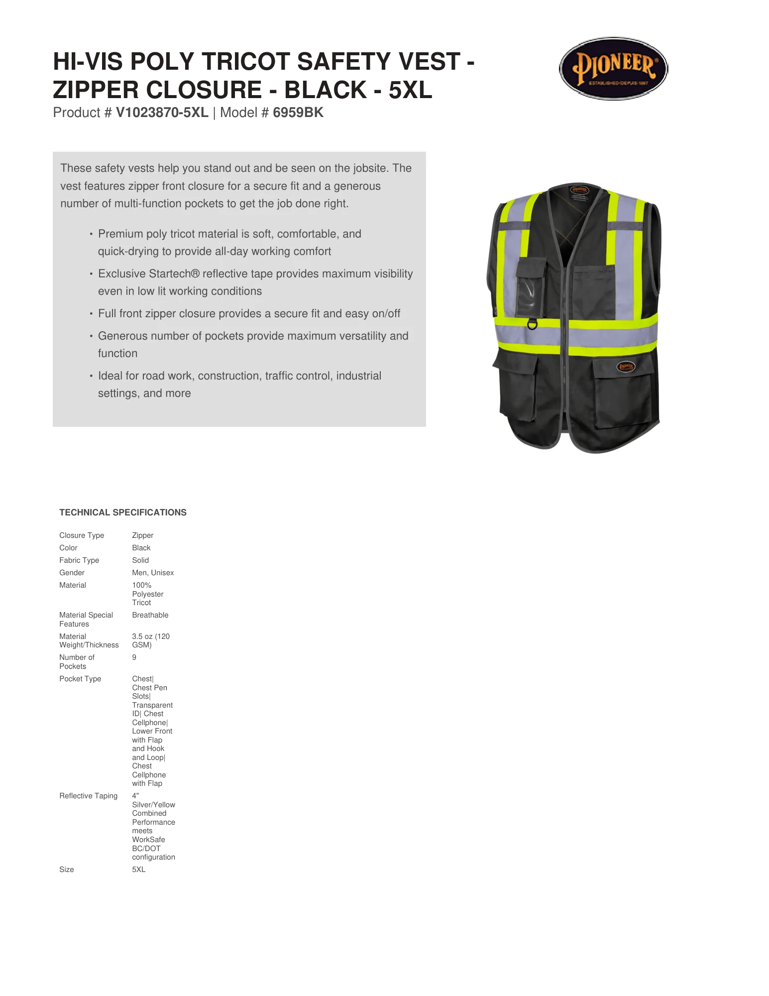 Hi-Vis Poly Tricot Safety Vest - Zipper Closure - Black - 5XL- Tech Document– Technical Specs