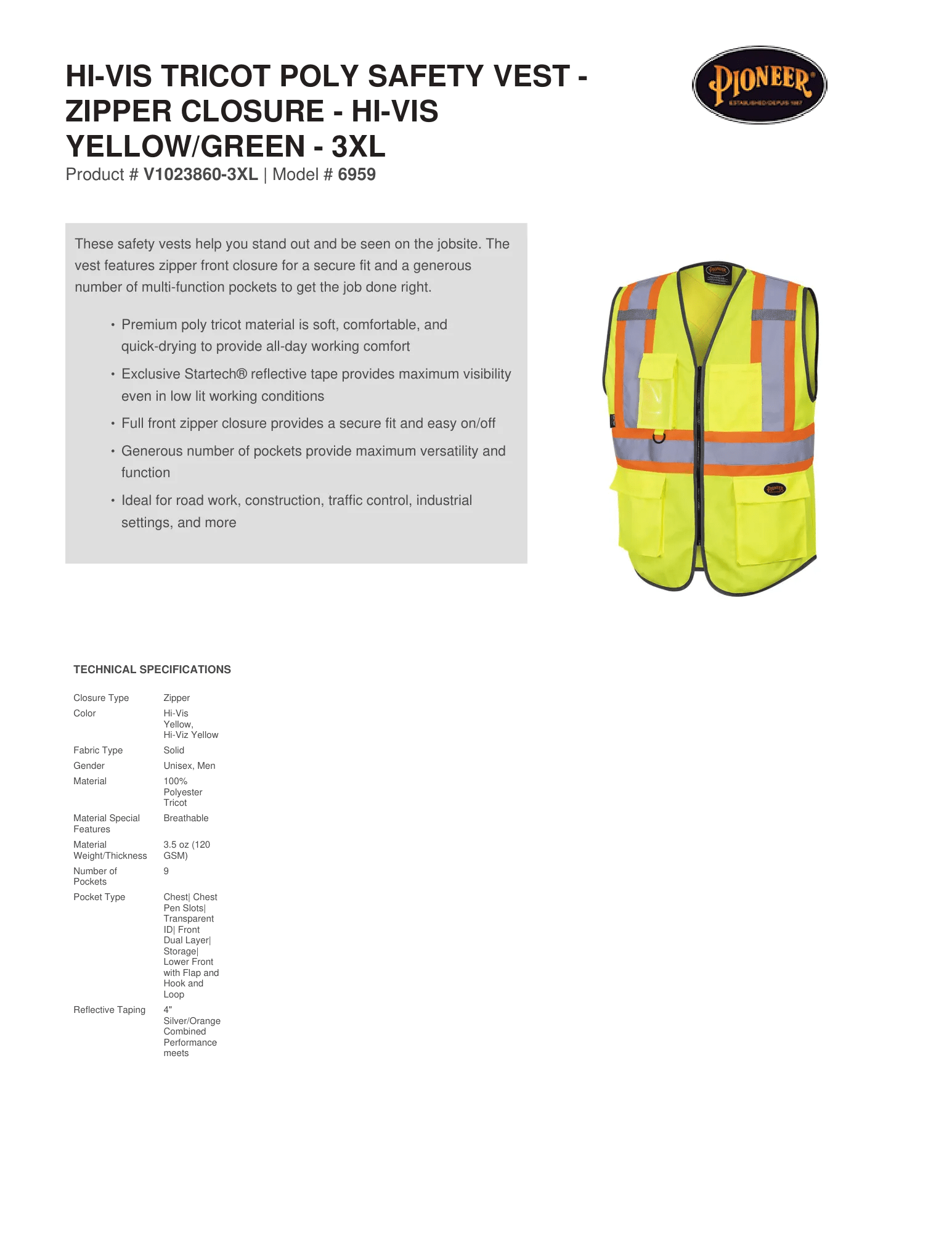 Hi-Vis Tricot Poly Safety Vest - Zipper Closure - Technical Specs - Pioneer-Sizing-Chart