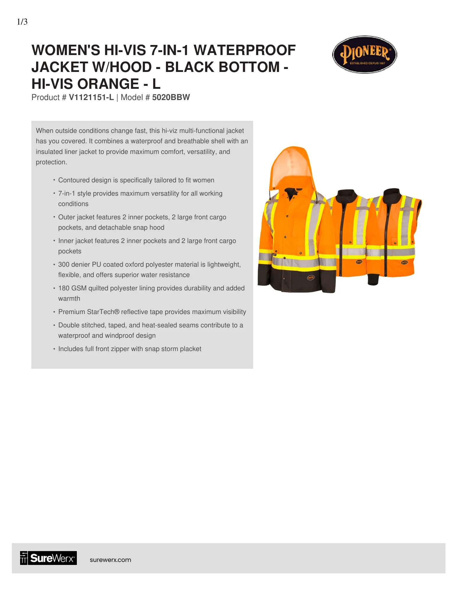 Women's Hi-Vis 7-in-1 Waterproof Jacket w/Hood - Black Bottom - Hi-Vis Orange - M- Tech Document– Technical Specs