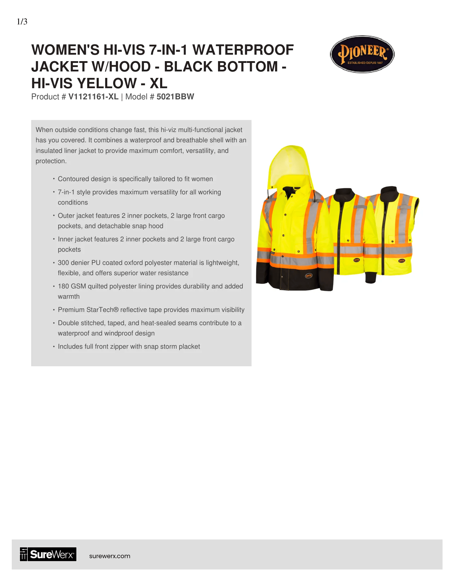Women's Hi-Vis 7-in-1 Waterproof Jacket w/Hood - Black Bottom - Hi-Vis Yellow - XL- Tech Document– Technical Specs
