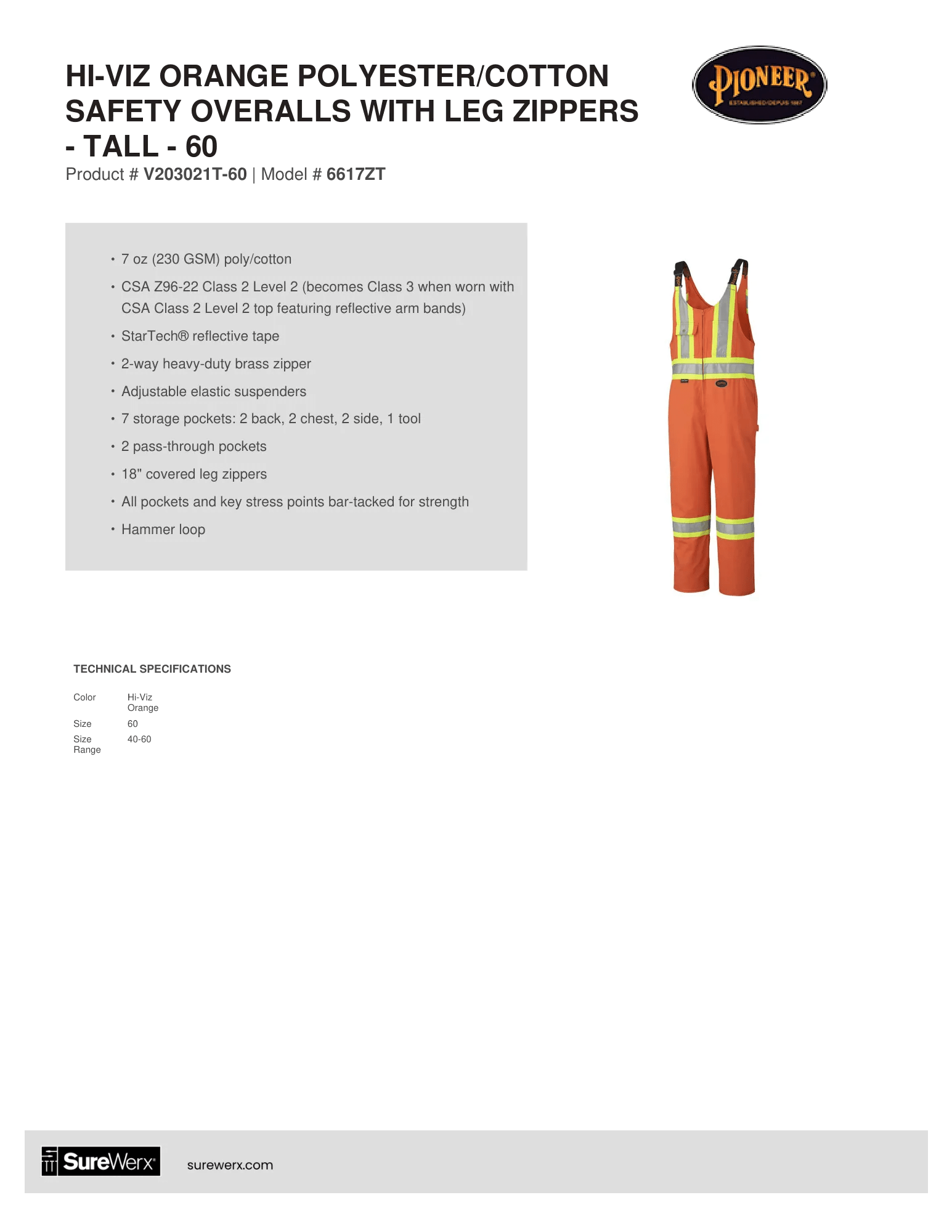 Hi-Viz Orange Polyester/Cotton Safety Overall 7 Oz with Leg Zippers - Tall | Pioneer