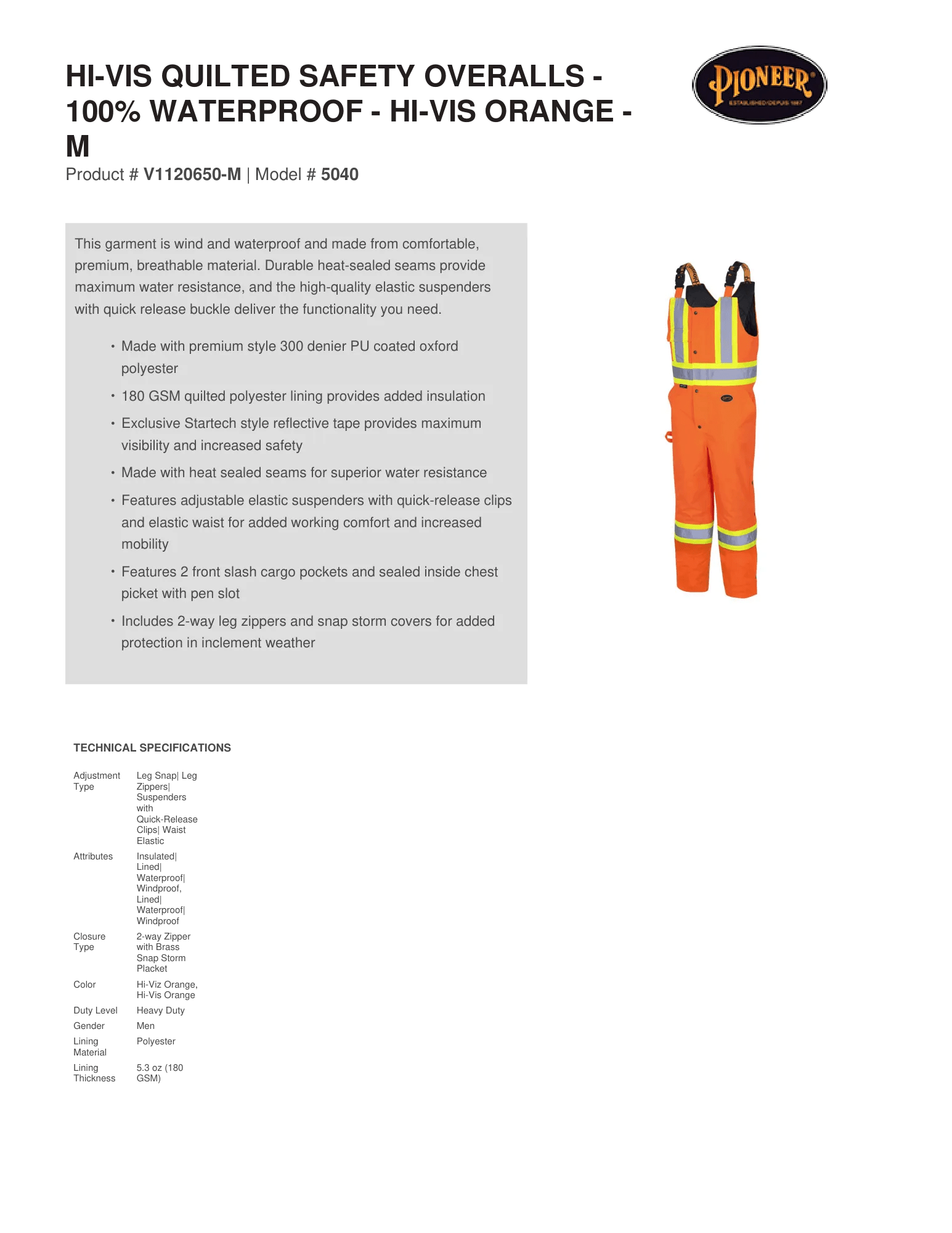 Hi-Vis Quilted Safety Overalls - 100% Waterproof - Hi-Vis Orange - L– Technical Specs