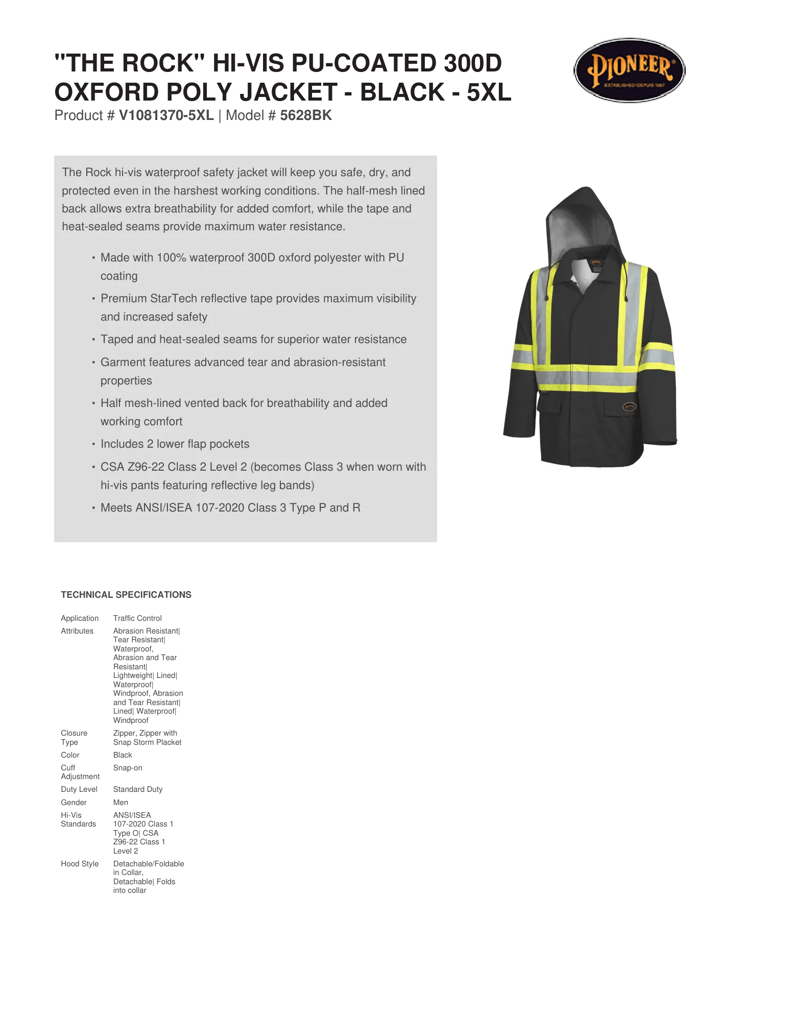"The Rock" Hi-Vis PU-Coated 300D Oxford Poly Jacket - Black – Technical Specs - Pioneer-Sizing-Chart