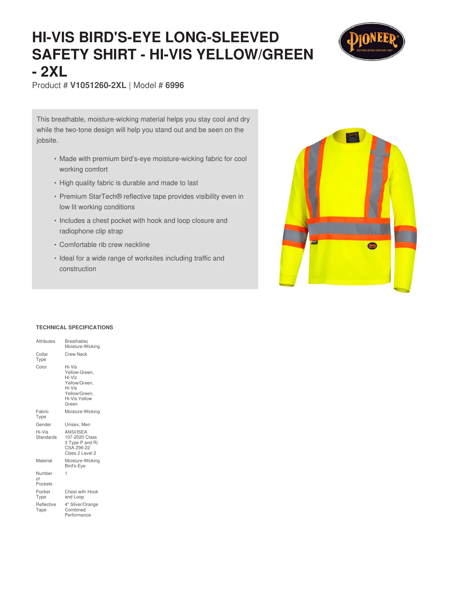 Hi-Vis Bird's-Eye Long-Sleeved Safety Shirt - Hi-Vis Yellow/Green - 2XL– Technical Specs