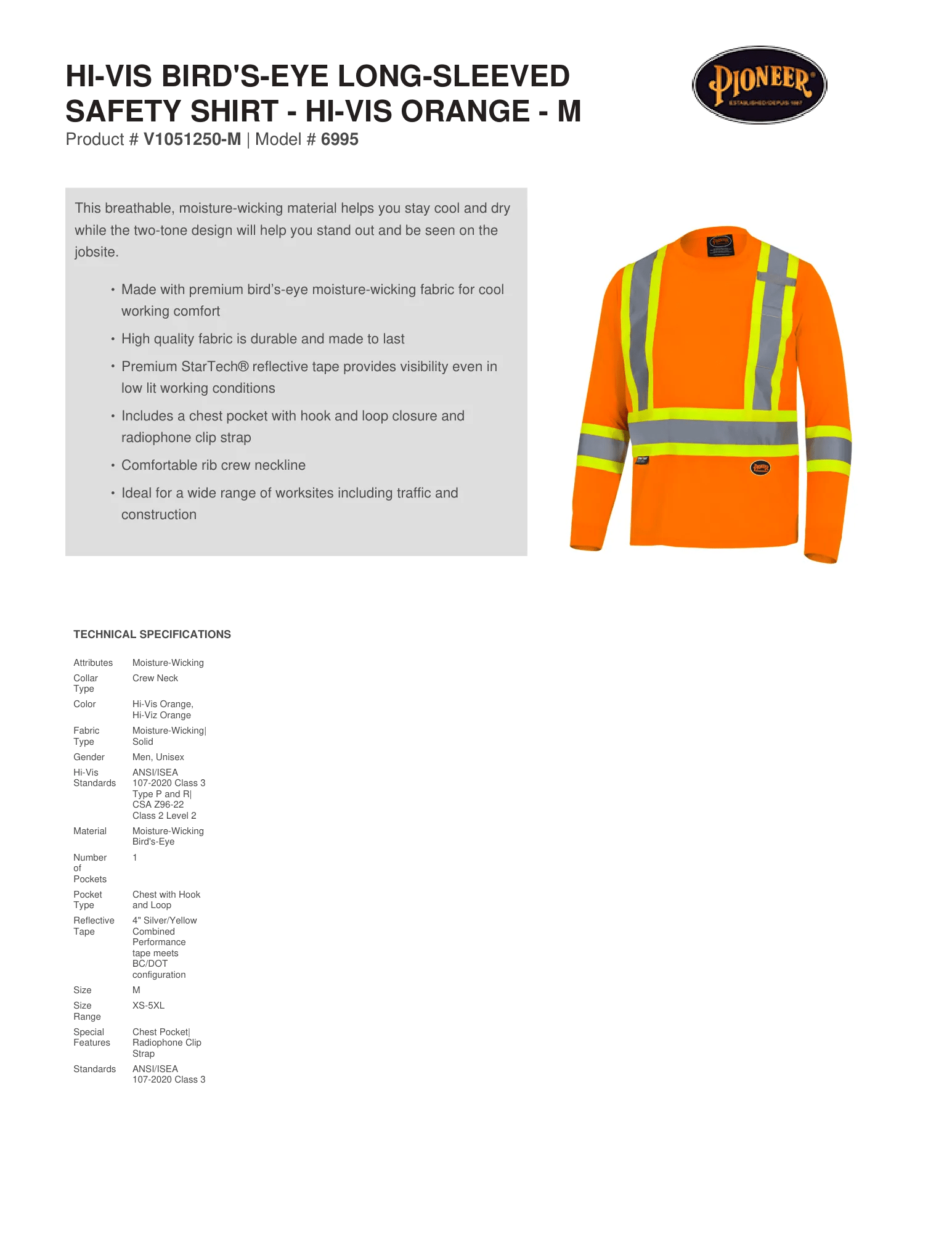Hi-Vis Bird's-Eye Long-Sleeved Safety Shirt - Hi-Vis Orange - XL– Technical Specs