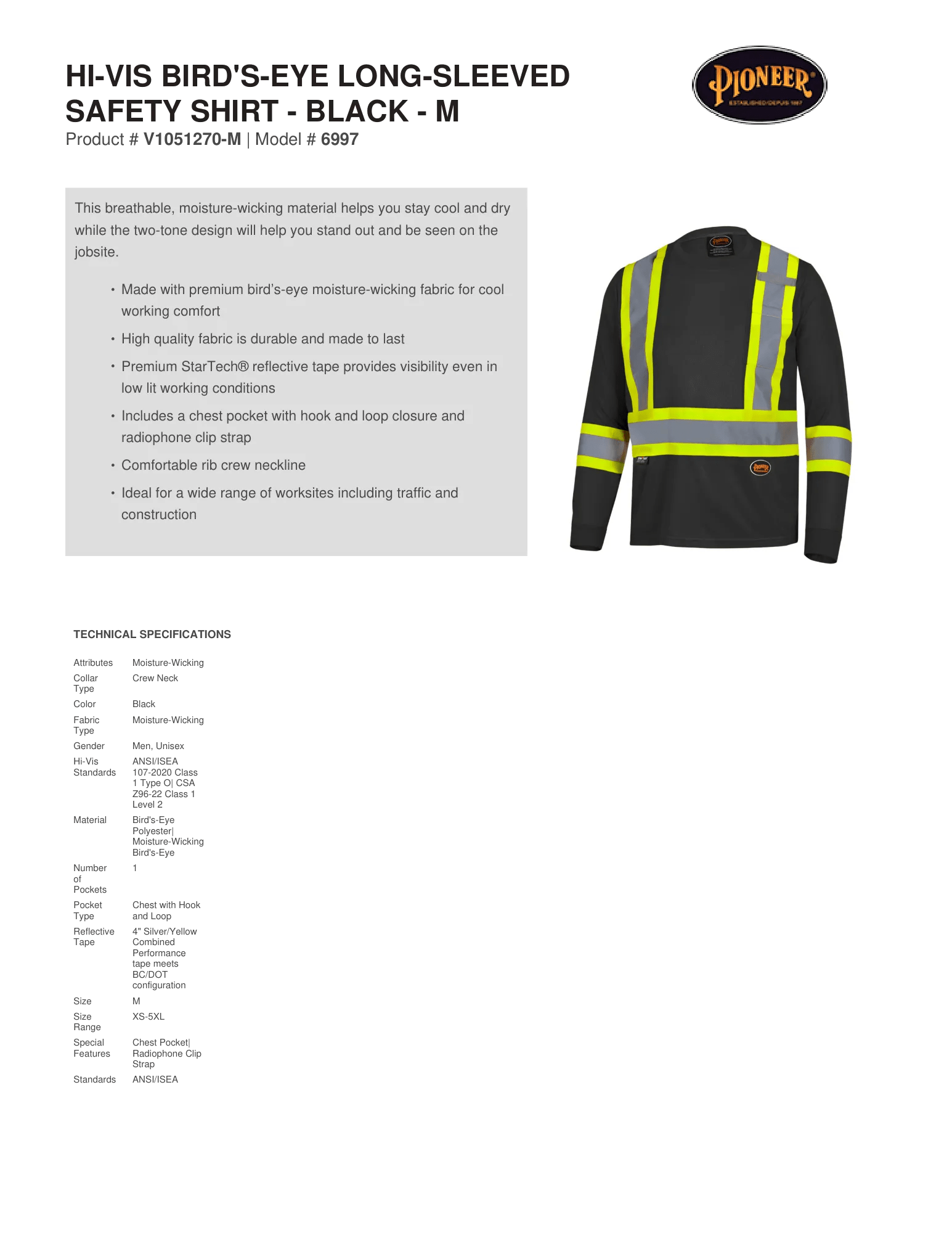 Hi-Vis Bird's-Eye Long-Sleeved Safety Shirt - Black - M– Technical Specs