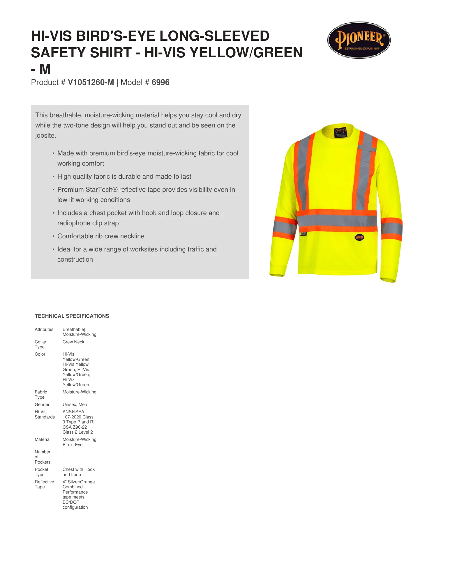 Hi-Vis Bird's-Eye Long-Sleeved Safety Shirt - Hi-Vis Yellow/Green - M– Technical Specs