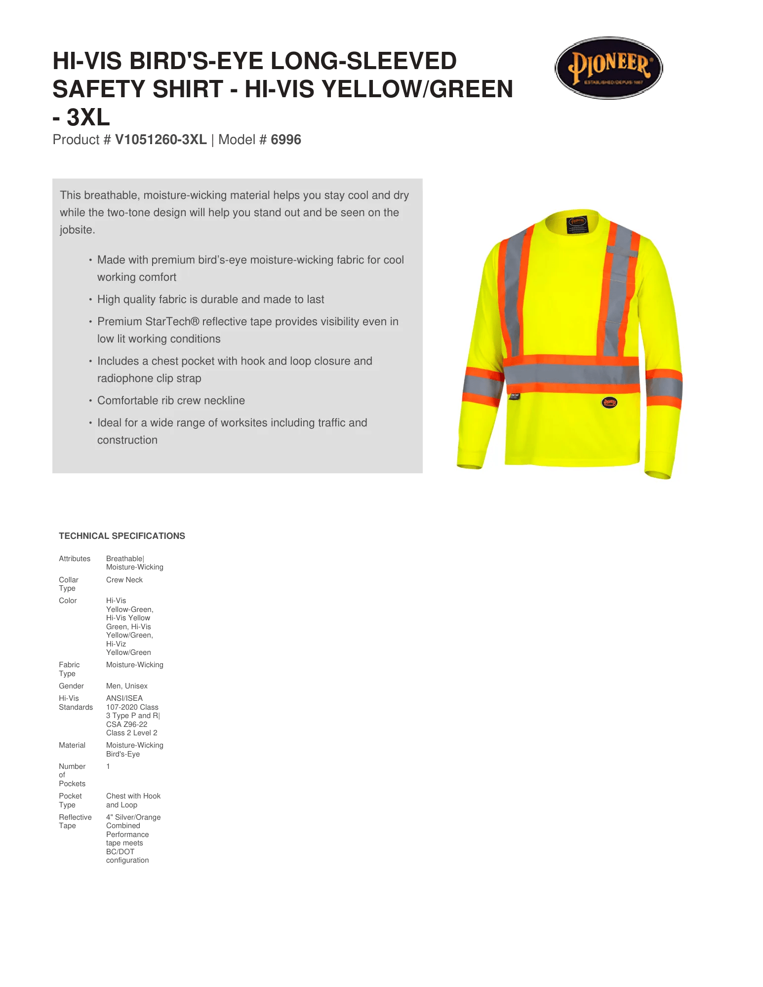 Hi-Vis Bird's-Eye Long-Sleeved Safety Shirt - Hi-Vis Yellow/Green - 3XL– Technical Specs