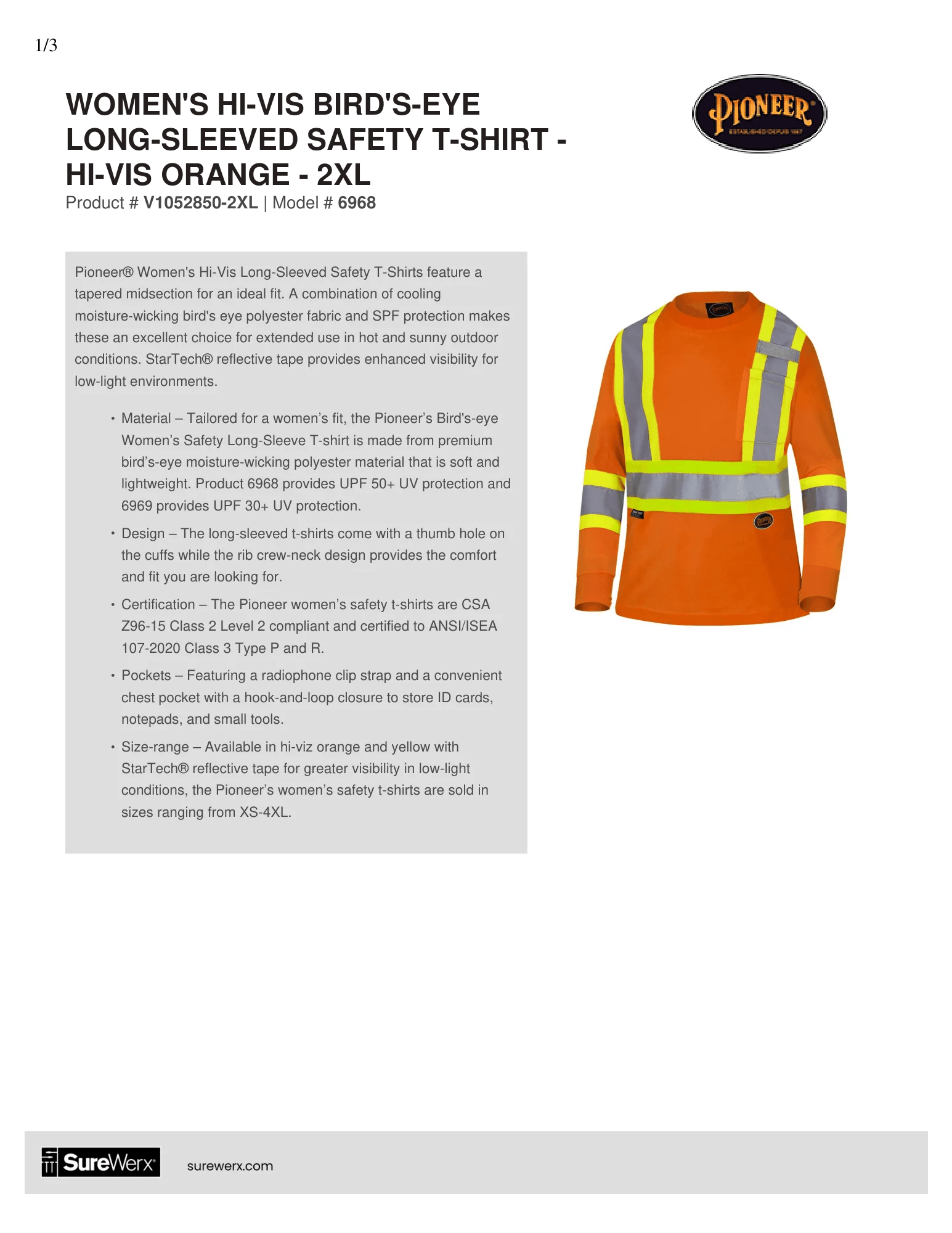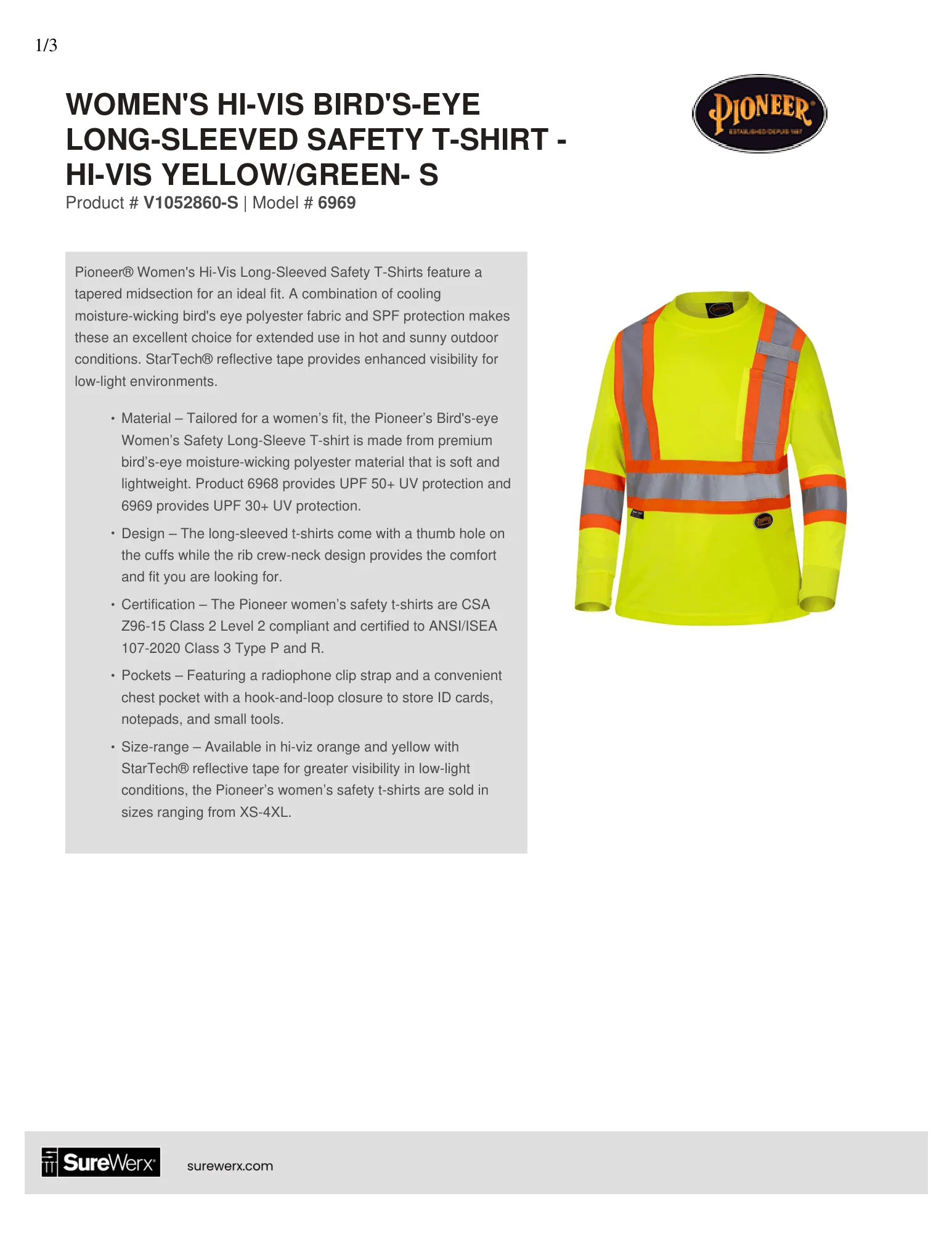 - Material – Tailored for a women’s fit the Pioneer’s Bird's-eye Women’s Safety Long-Sleeve T-shirt is made from premium bird’s-eye moisture-wicking polyester material that is soft and lightweight. Product 6968 provides UPF 50+ UV protection and 6969 provides UPF 30+ UV protection.