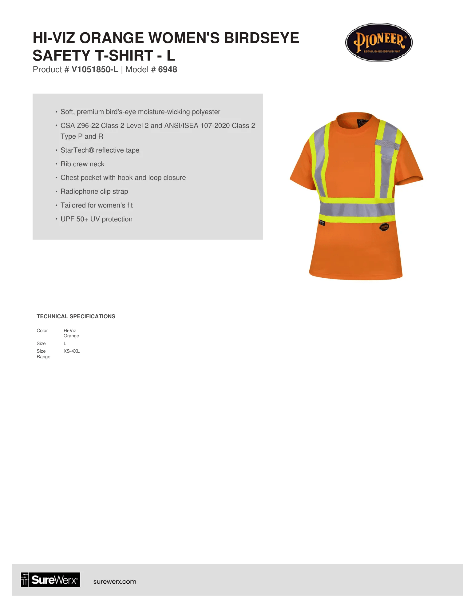 Women's Hi-Vis Bird's-Eye Safety T-Shirt - Hi-Vis Orange - XL– Technical Specs